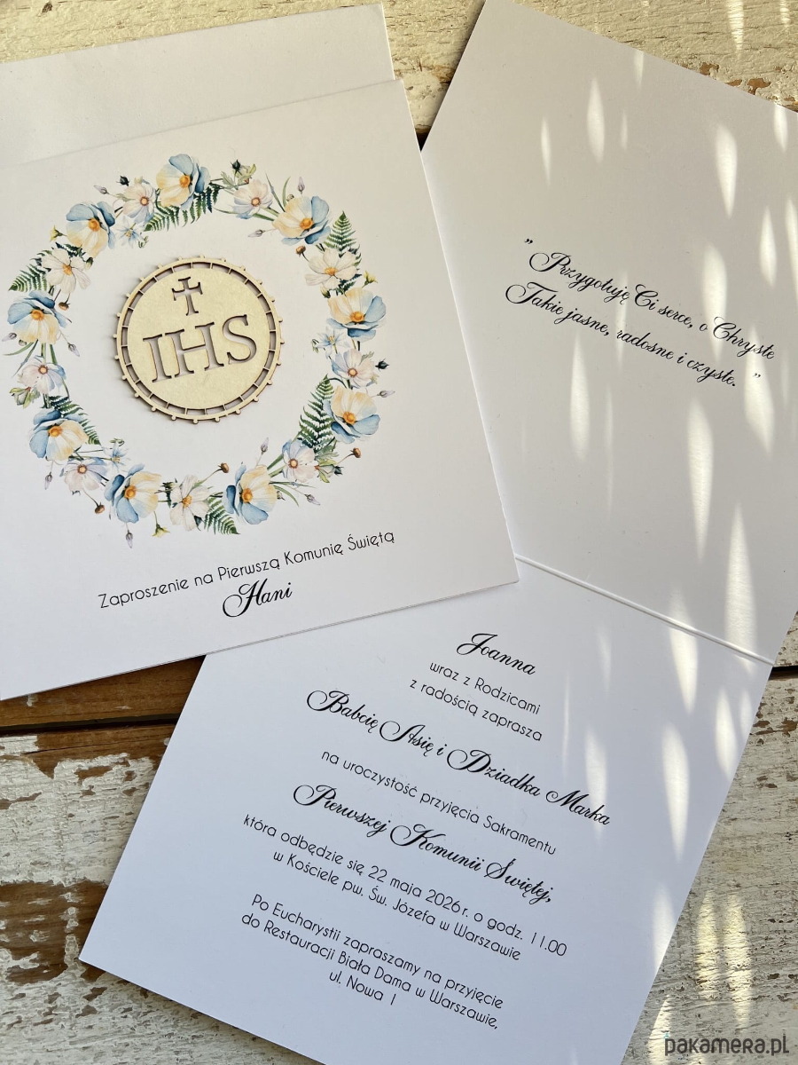 Zaproszenia na komunię o wymiarze 14x14 cm wykonane z białego wysokiej jakości papieru o gramaturze 300.