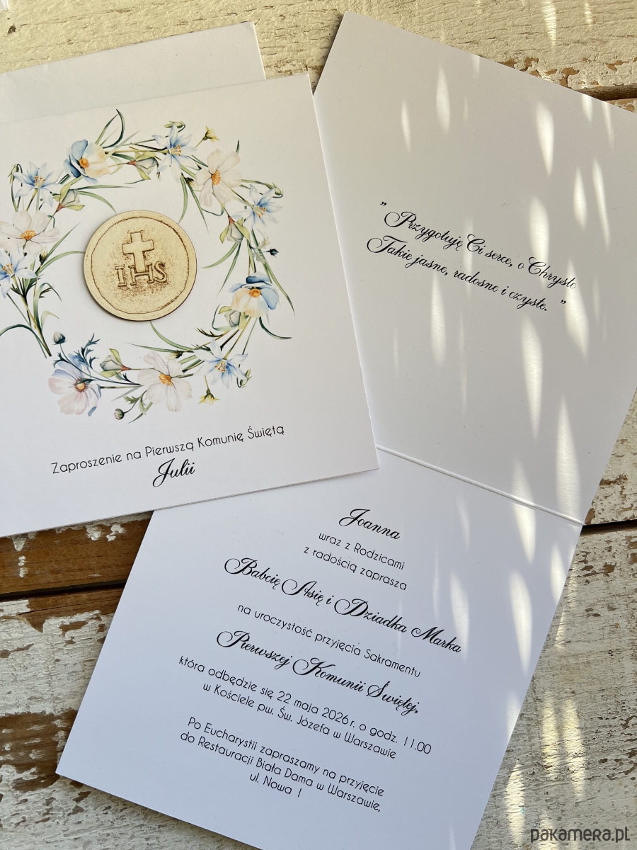 Białe eleganckie zaproszenia komunijne, na komunię ręcznie robione z wiankiem - wianek z personalizacją