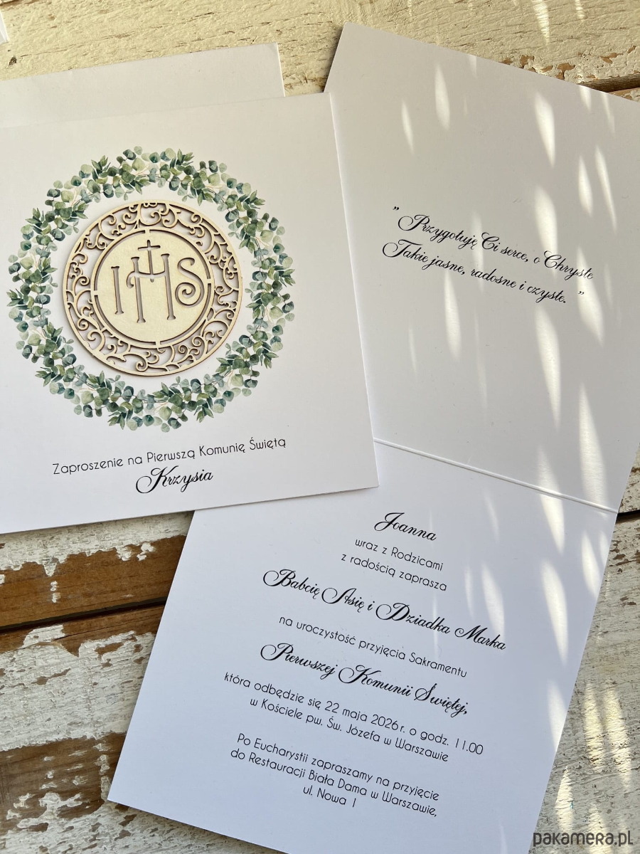 Białe eleganckie zaproszenia komunijne, na komunię ręcznie robione z wiankiem - wianek z personalizacją
