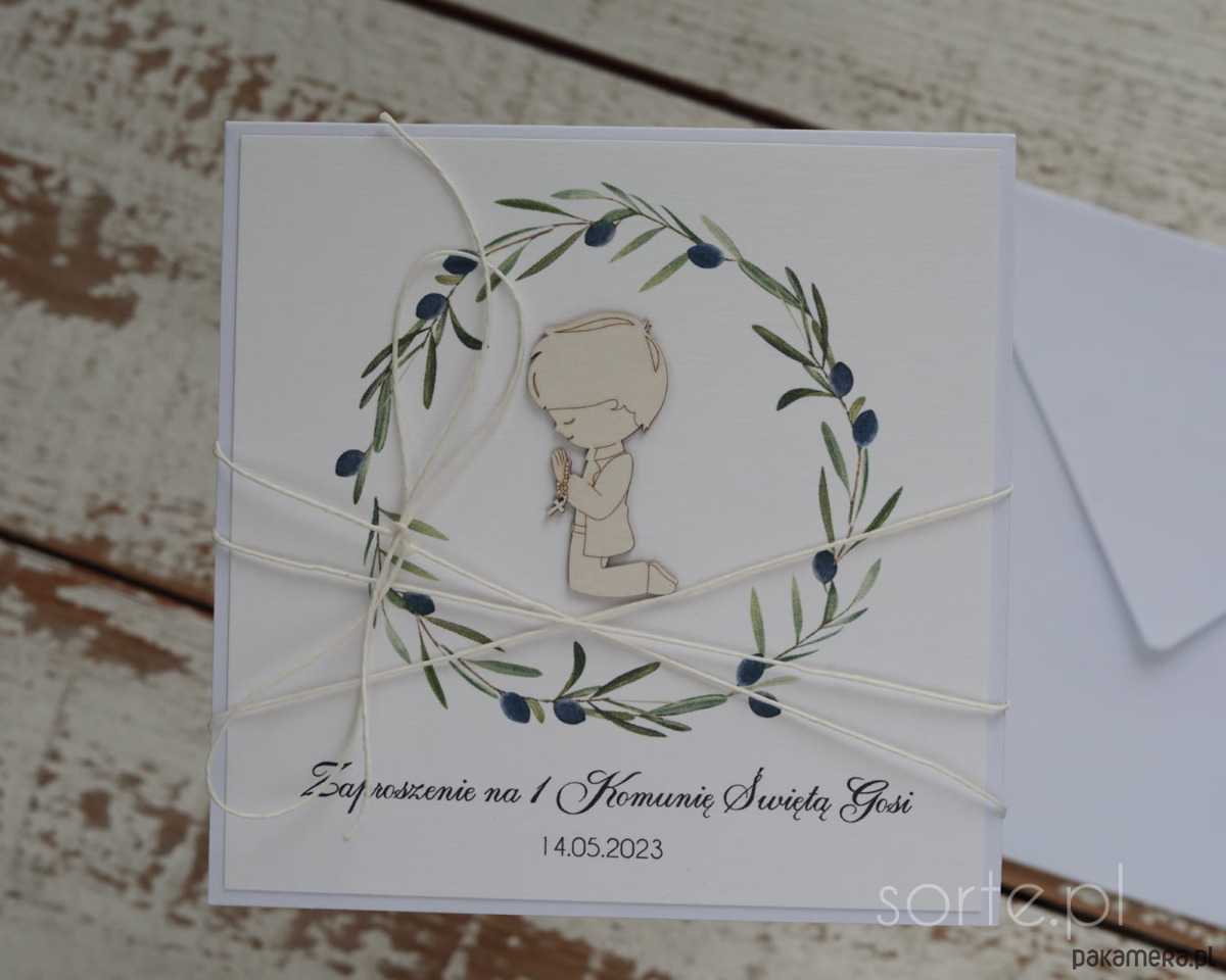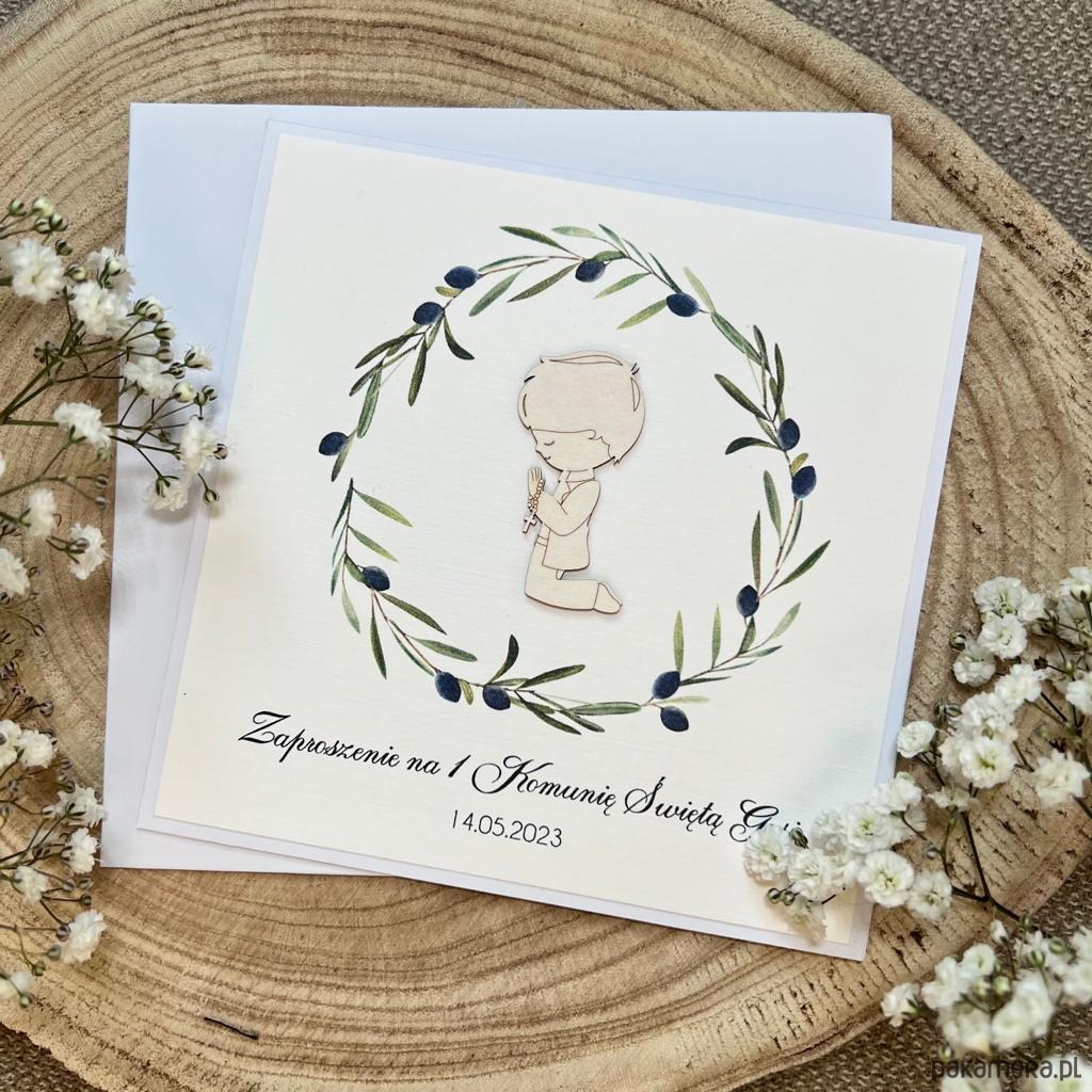 Białe eleganckie zaproszenia komunijne z personalizacją dla chłopca