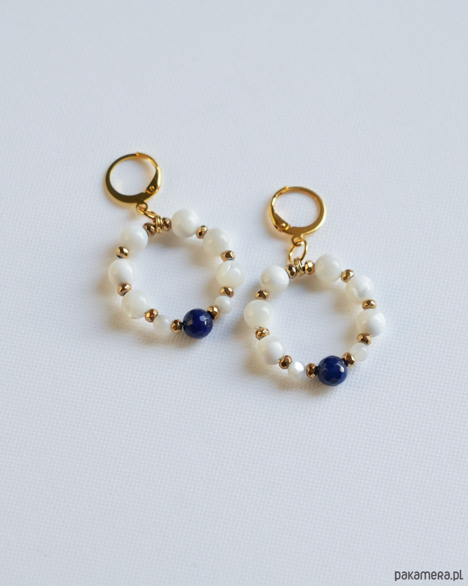 Delikatne kolczyki z kółkami wykonanymi z opalizującej, białej MASY PERŁOWEJ, złotego HEMATYTU oraz granatowego JADEITU. Okrągłe, zamykane bigle i kółka montażowe to STAL SZLACHETNA w kolorze złotym.