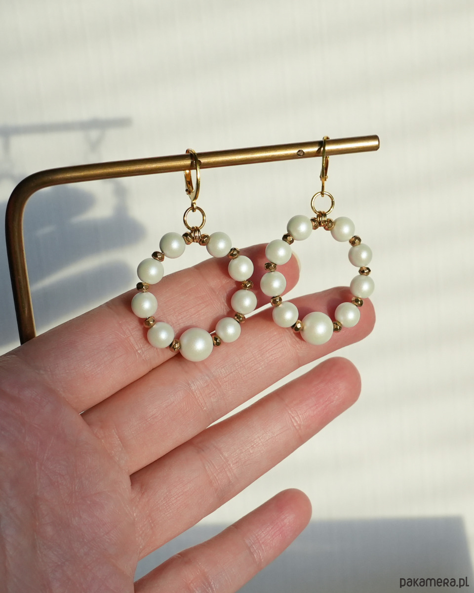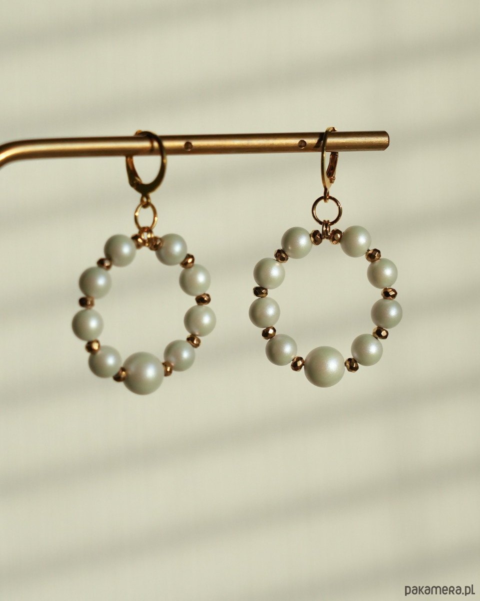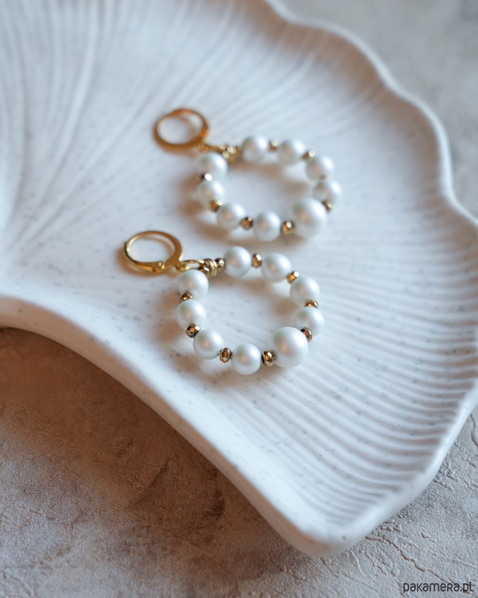 Delikatne kolczyki z kółkami wykonanymi z białych, CERAMICZNYCH PEREŁ o pięknym, satynowym wykończeniu oraz złotego HEMATYTU. Okrągłe, zamykane bigle i kółka montażowe to STAL SZLACHETNA w kolorze złotym.