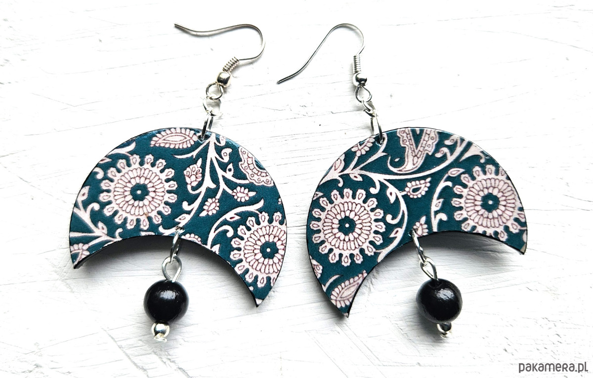 kolczyki drewniane, ozdobione metodą decoupage, dwustronne, starannie wykończone farbami akrylowymi i zabezpieczone wielokrotnie lakierem, koraliki drewniane, bigle posrebrzane, długość kolczyków bez bigli: 5 cm, szerokość: 4 cm, bardzo lekkie
