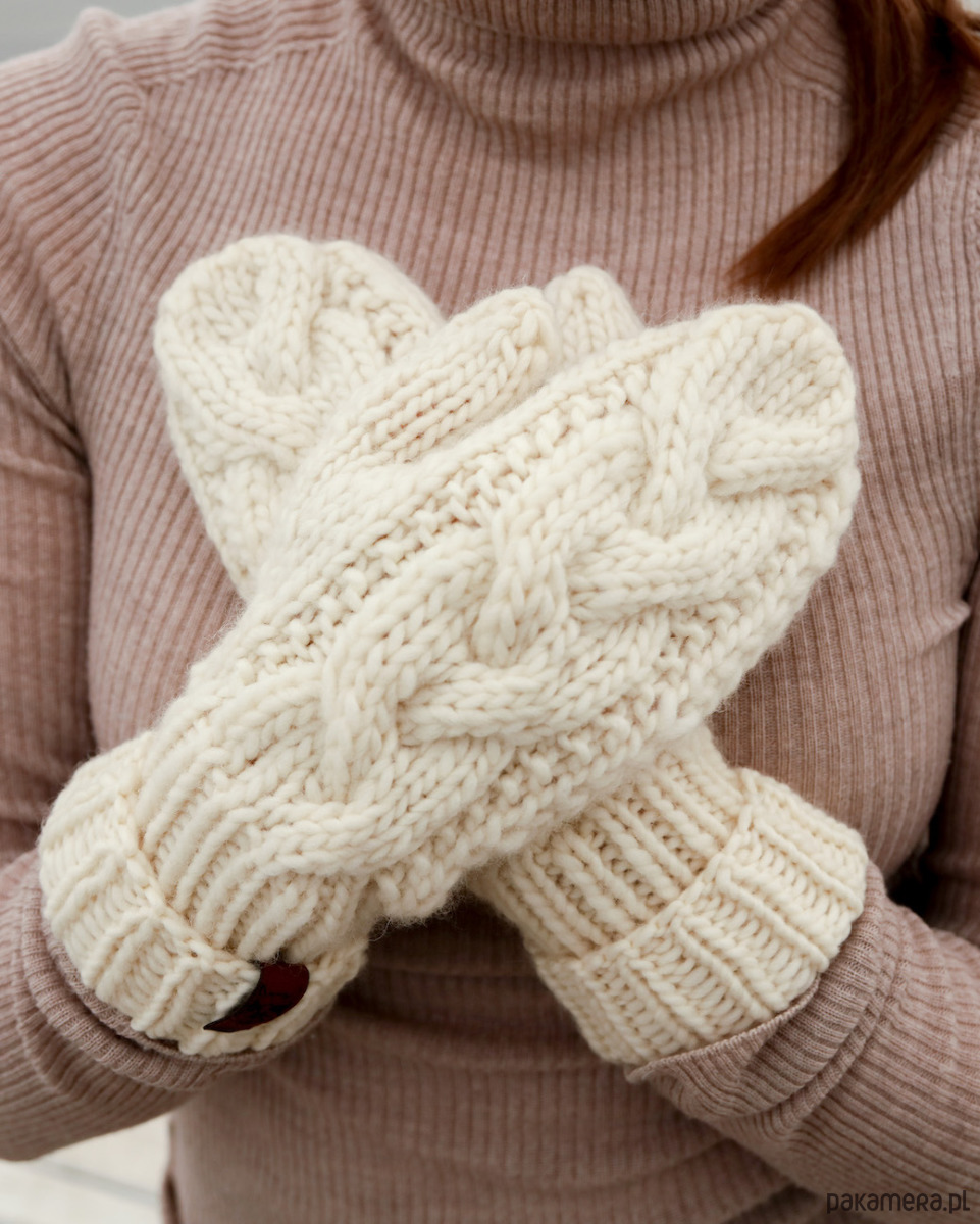Białe rękawiczki wełniane z jednym palcem w warkocze wykonane są na drutach z ciepłej i przyjemnej w dotyku 100% wełny peruwiańskiej. Mają charakterystyczny dla wełnianych dzianin wzór w warkocze, który pięknie wpasowuje się w zimowe stylizacje. Stworzy komplet z białą opaską w warkocze.