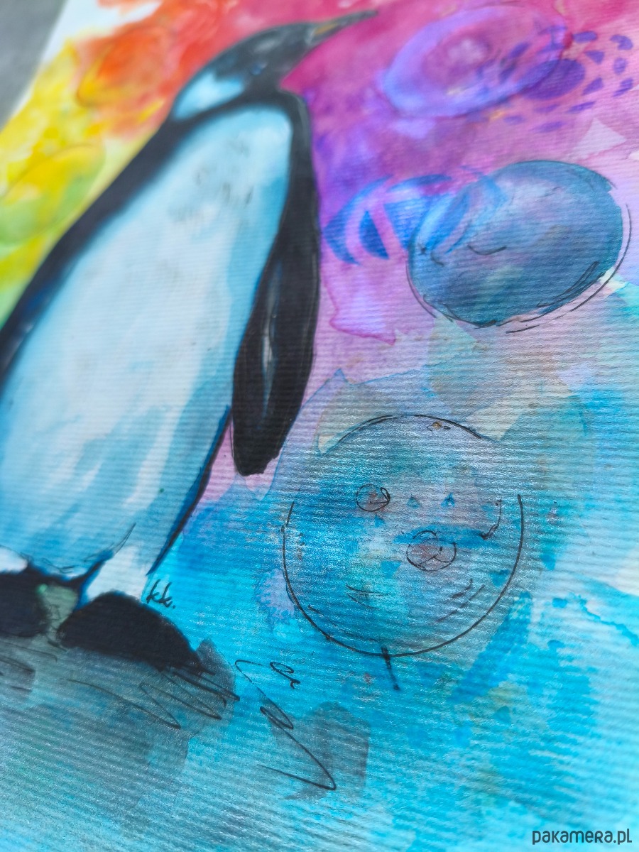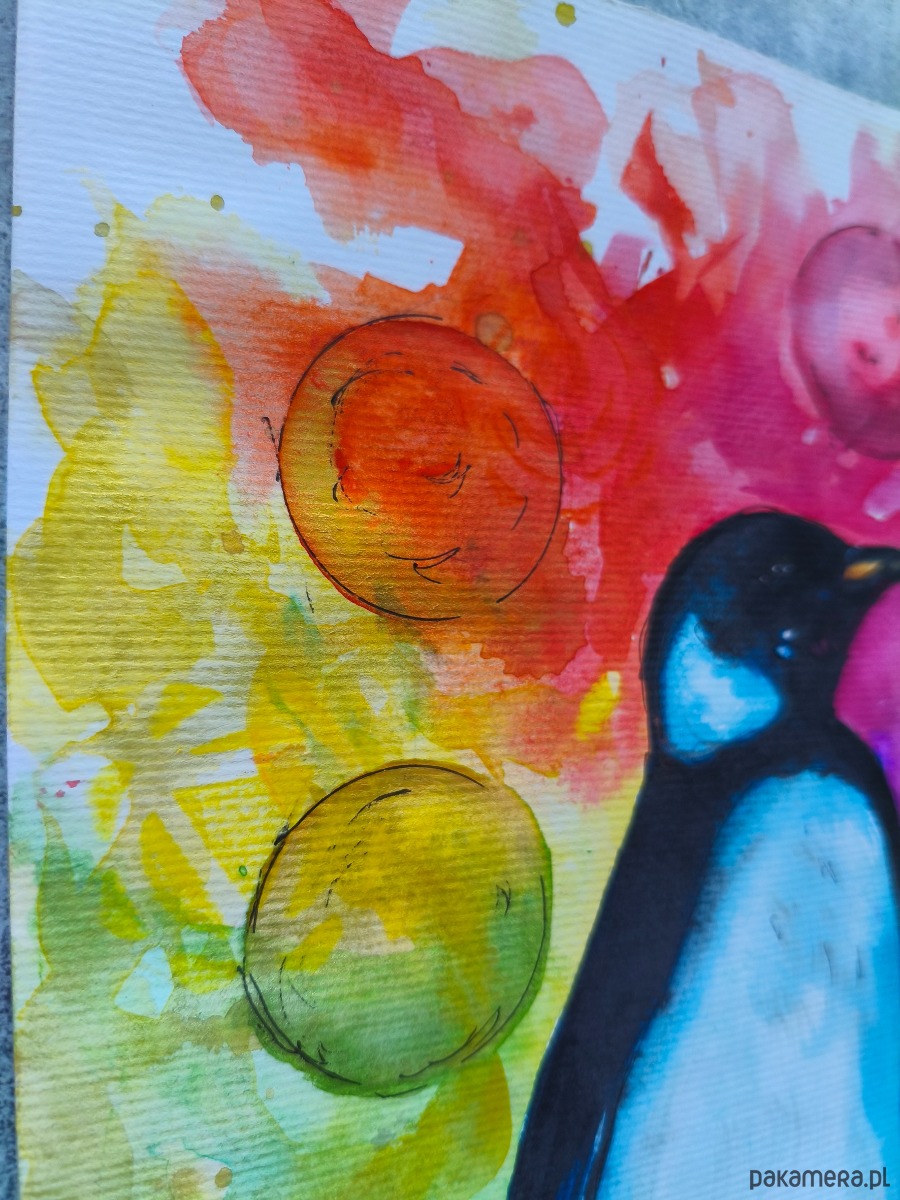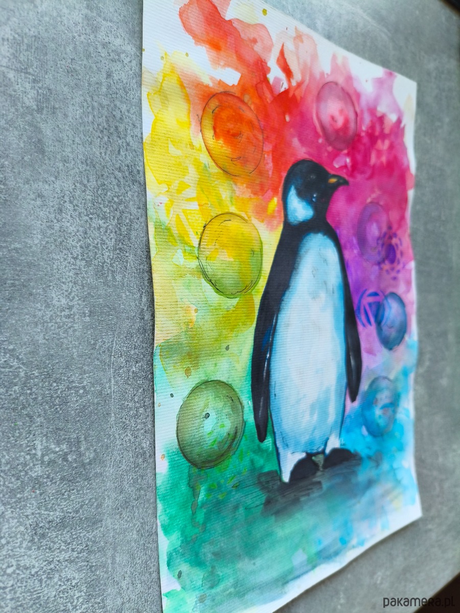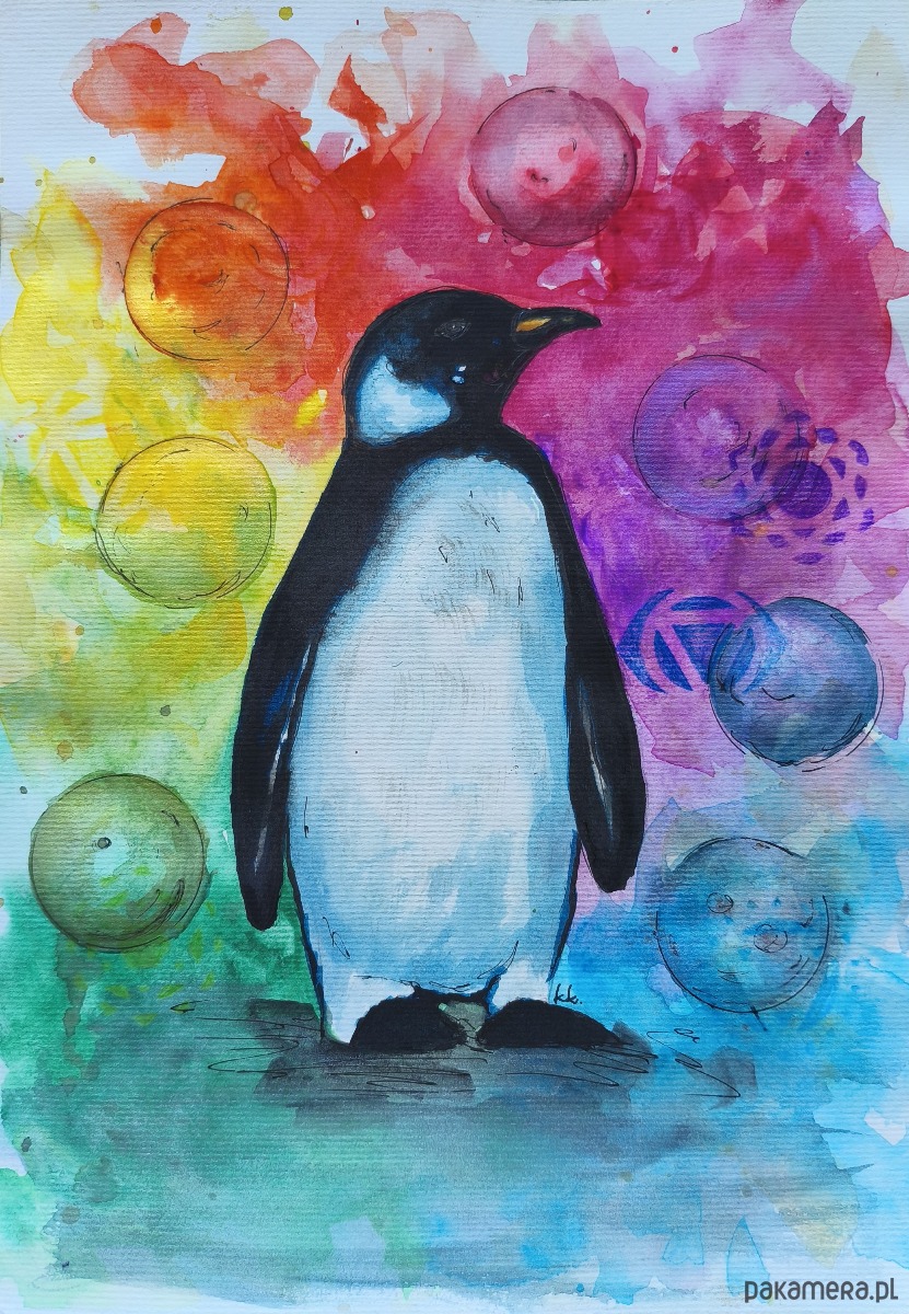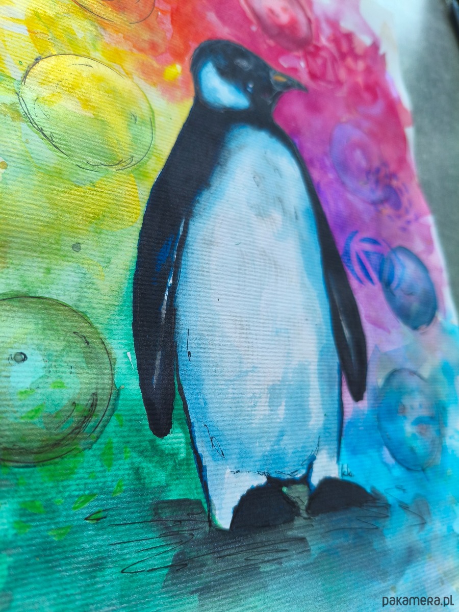 Biało-Czarna Tęcza Obraz Akwarela Pingwin Przewodnik Duchowy Czakry 21x30