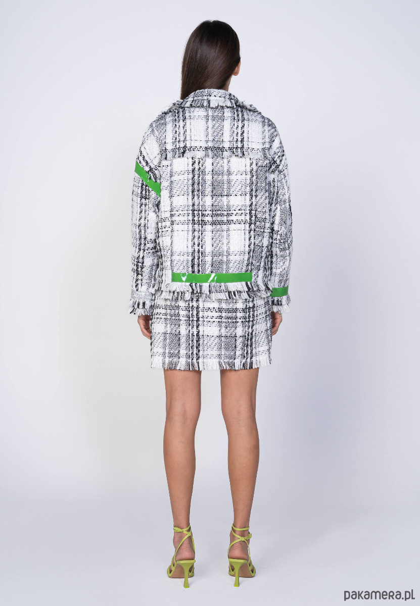 Kurtka wykonana jest z miękkiego i przyjemnego w dotyku materiału, który gwarantuje wygodę i komfort podczas noszenia. Czarno-biały wzór kurtki tworzy oryginalny i modny look, który doskonale komponuje się z mini spódnicą. Ta mała, ale mocno eksponująca nogi spódnica doskonale uzupełnia kurtkę, tworząc całość, która jest nie tylko modna, ale i elegancka.