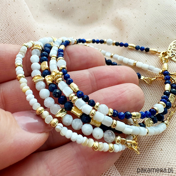 Elegancki, efektowny komplet bransoletek w kolorystyce biało granatowej. Skomponowane z delikatnych koralików z masy perłowej, lapis lazuli i kamieni księżycowych.Bransoletki można nosić oddzielnie lub osobno w dowolnych zestawieniach.