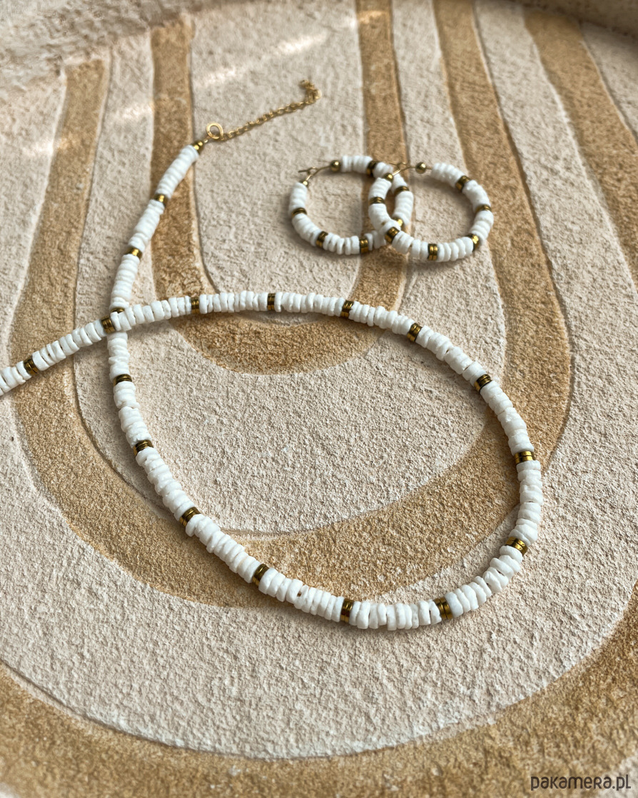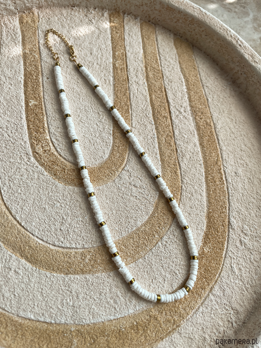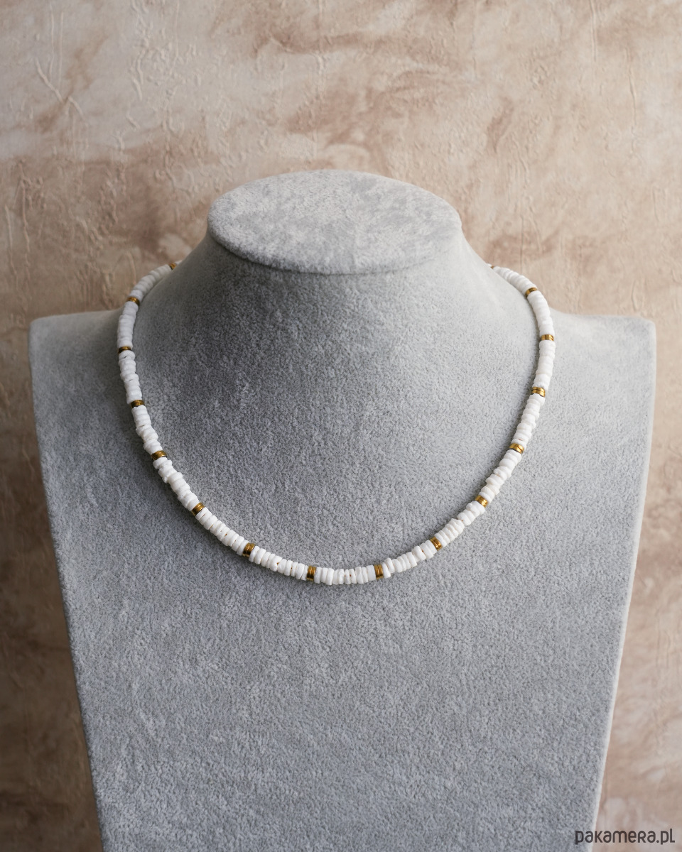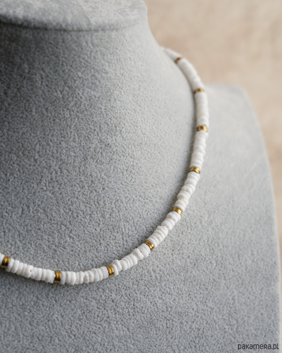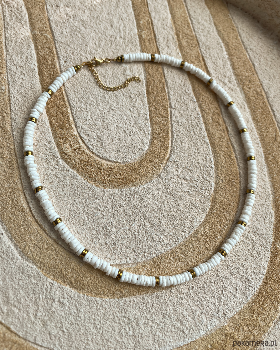 Naszyjnik (choker) wykonany z krążków białej MUSZLI o nieregularnym kształcie przeplatanych złotym HEMATYTEM. Zapięcie i łańcuszek to STAL SZLACHETNA w kolorze złotym.
