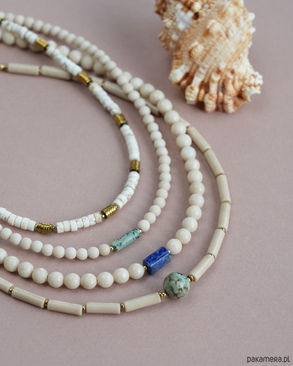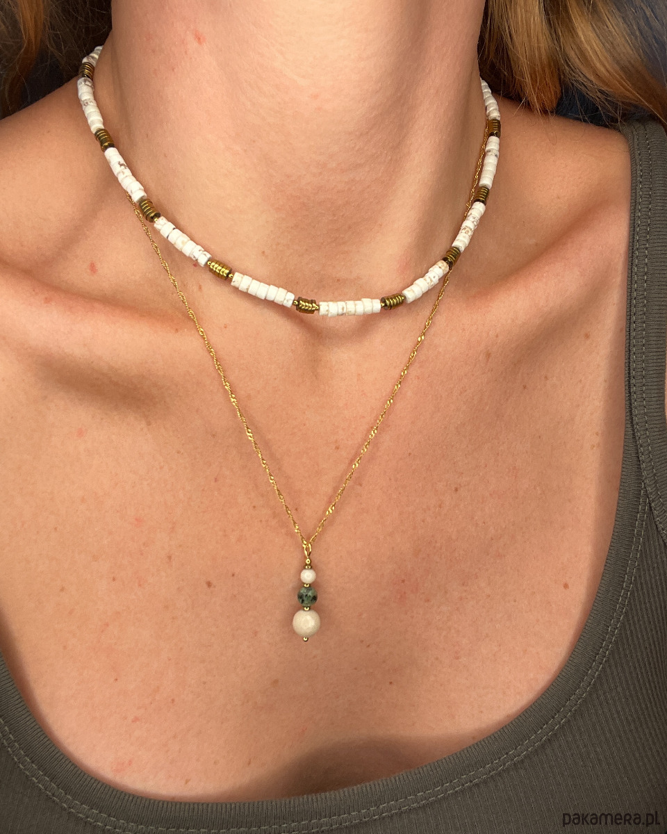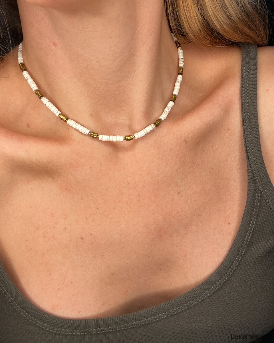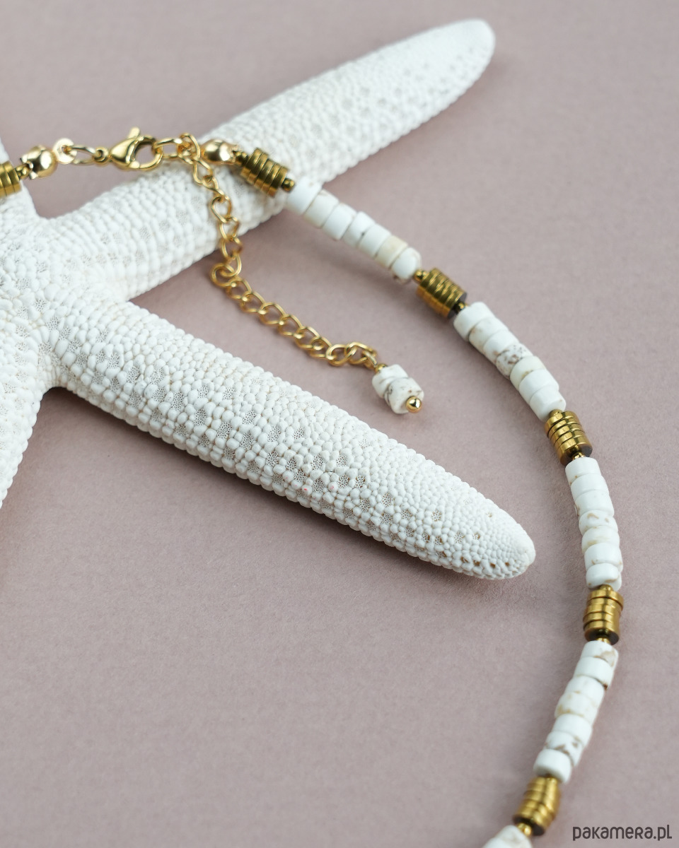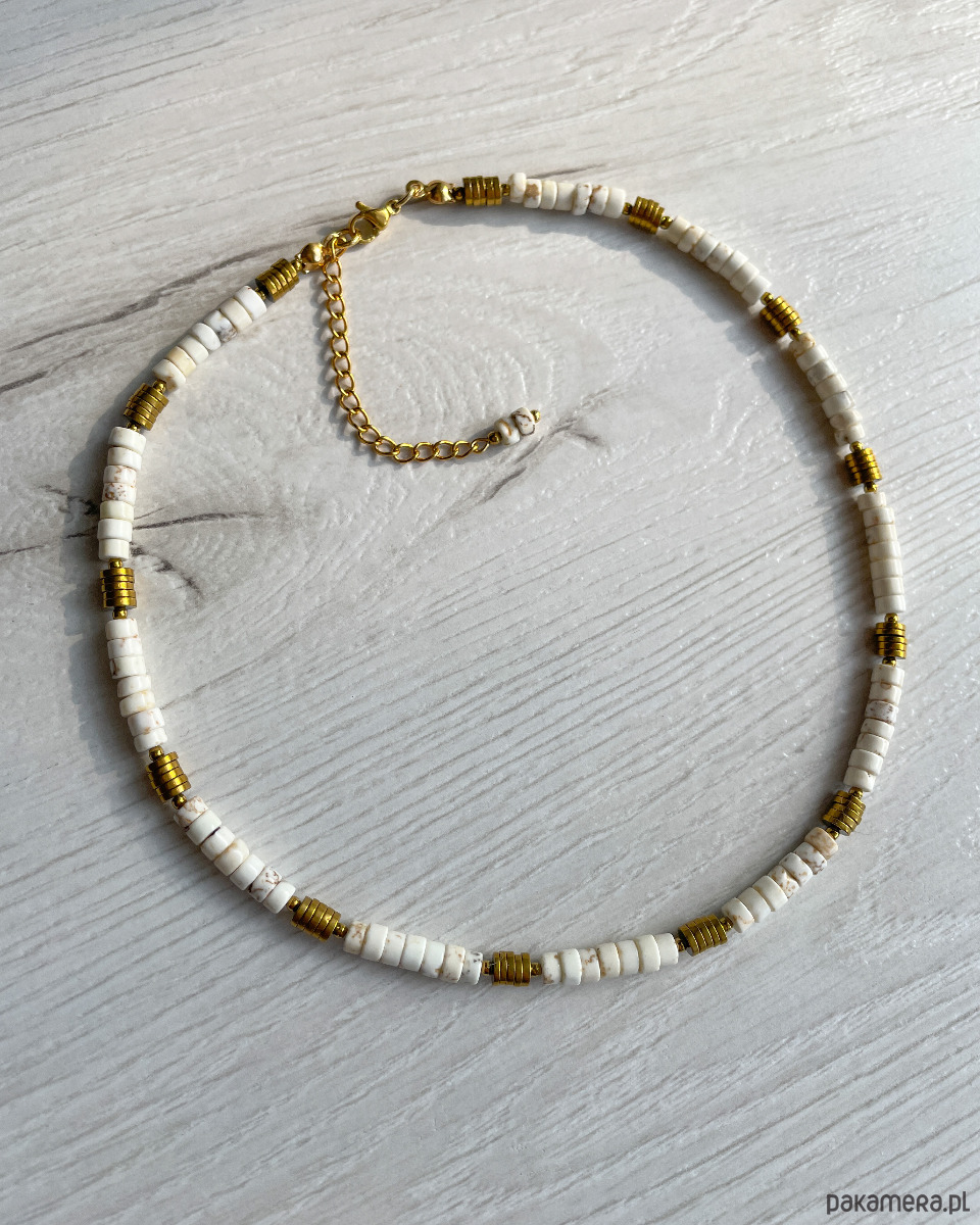 Minimalistyczny, biało-złoty naszyjnik choker z krążków howlitu i hematytu. Może być noszony solo, jak i w połączeniu z innymi naszyjnikami lub złotymi łańcuszkami i wisiorkami różnej długości, noszonymi kaskadowo.