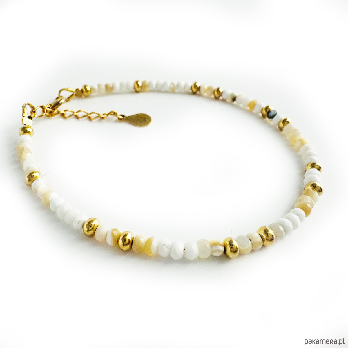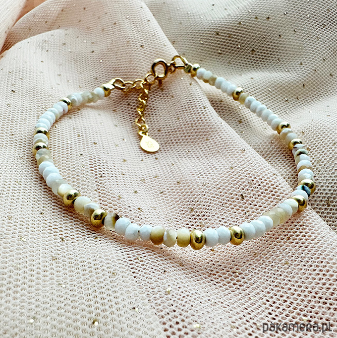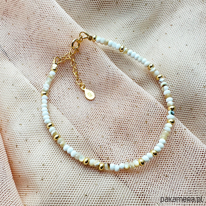 Ta bransoletka emanuje elegancją i urokiem, minimalistyczna, a zarazem przyciągająca wzrok kreacja w przepięknej palecie bieli, kremu i złota. co nadaje jej luksusowy wygląd. Odkryj urok i niezaprzeczalną moc masy perły, która, pobudza uczucia i sprawia, że emocje stają się bardziej harmonijne i zrównoważone, a ich wyrażanie łatwiejsze.