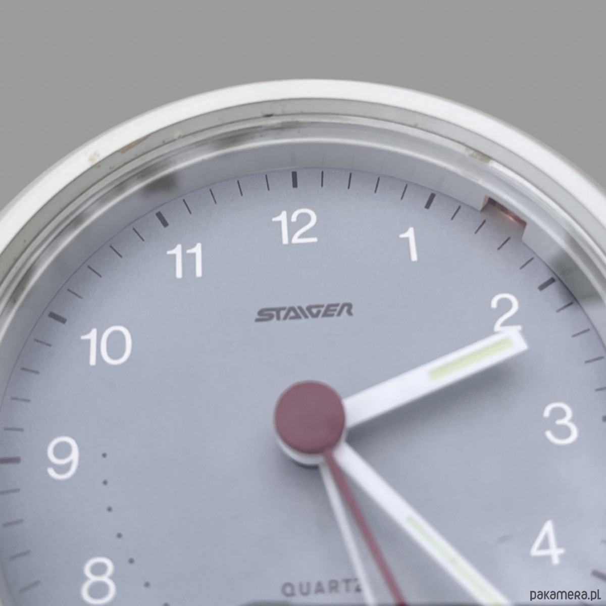 Jasny budzik Staiger, wyprodukowany w Niemczech na przełomie lat 80. i 90. Zegar w stylu future. Wykonany z tworzywa sztucznego. Zegar sprawny, nosi minimalne ślady użytkowania. Budzik na pojedynczą baterie AA, w pełni sprawny technicznie.