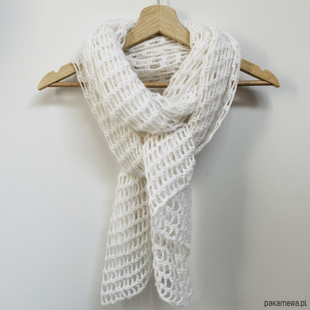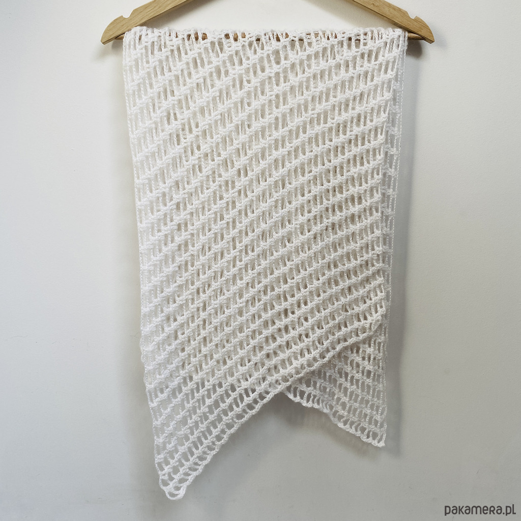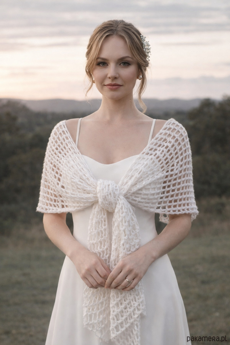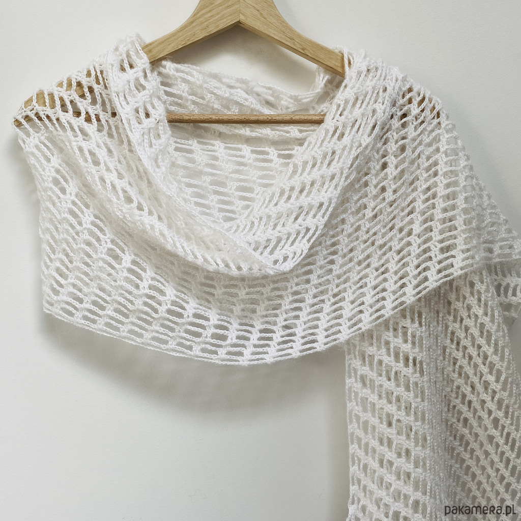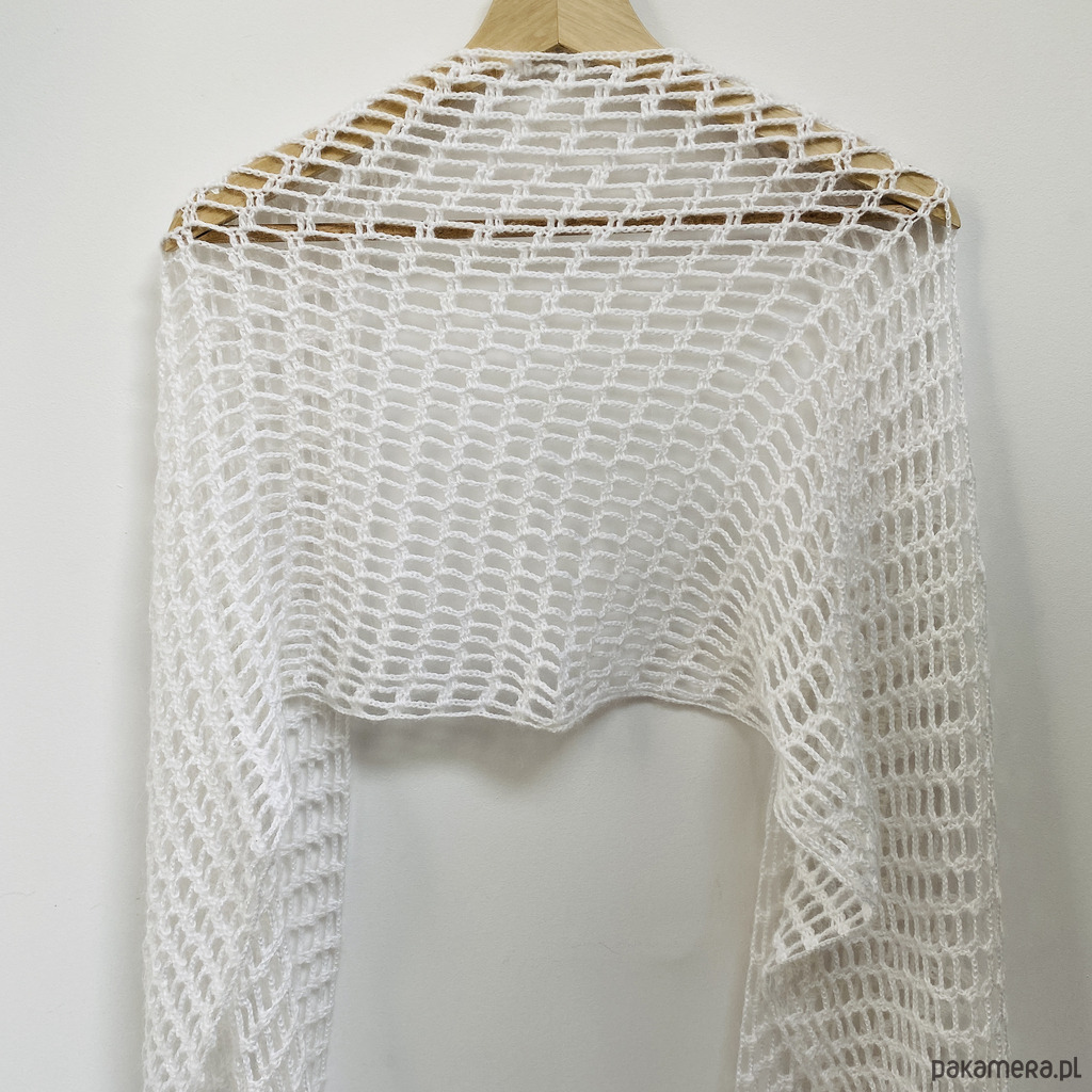 Elegancki, lekki szal ślubny wykonany ręcznie na szydełku z wysokiej jakości, miękkiej włóczki z delikatnym włoskiem Papatya Angora z certyfikatem OEKO-TEX® Standard 100. Klasyczny biały kolor sprawia, że etola idealnie pasuje do sukni ślubnej, ale sprawdzi się także po uroczystości jako subtelny dodatek do eleganckich i codziennych stylizacji.