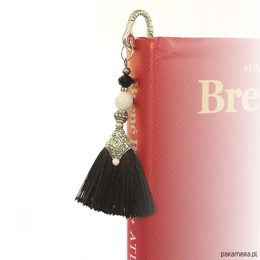Elegancka etno zakładka do książki z białym jadeitem i z oryginalnym chwostem w odcieniu ciemnoczekoladowym.