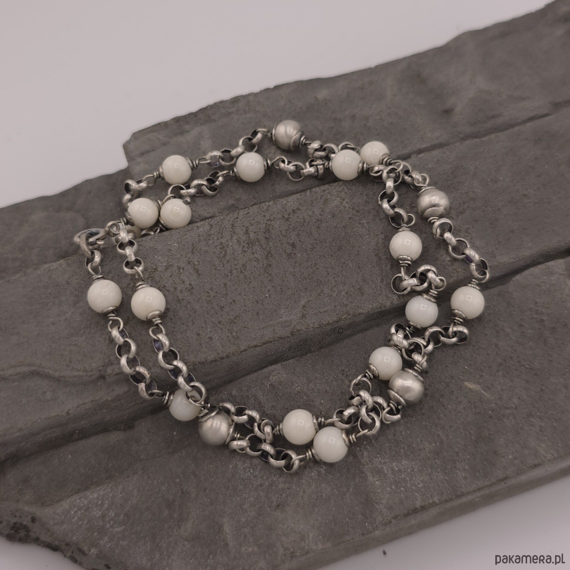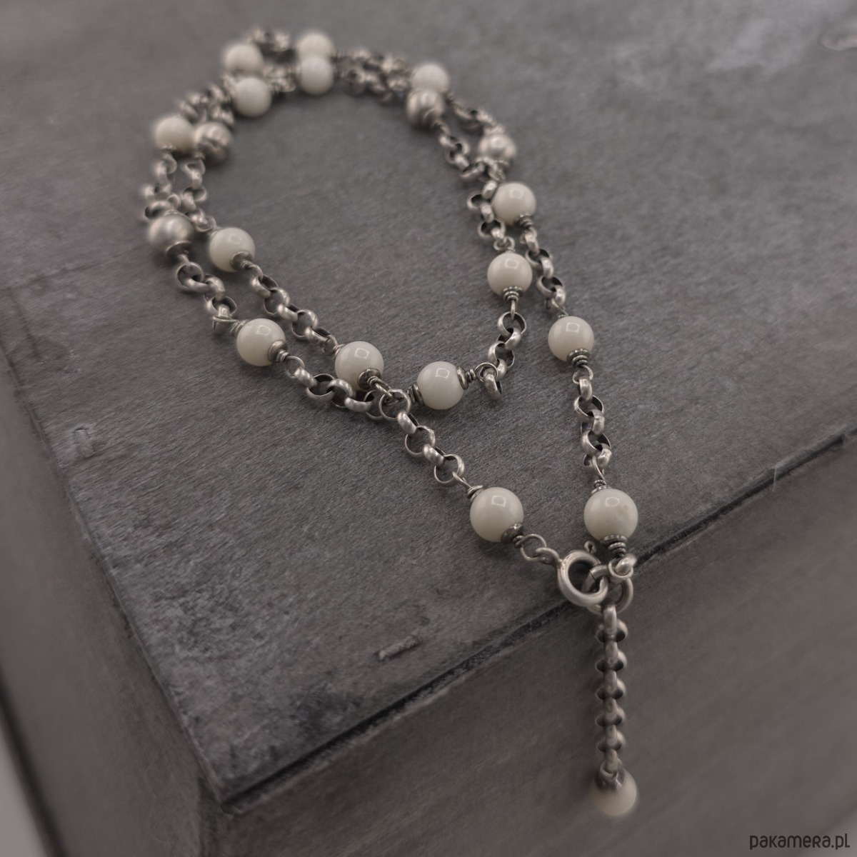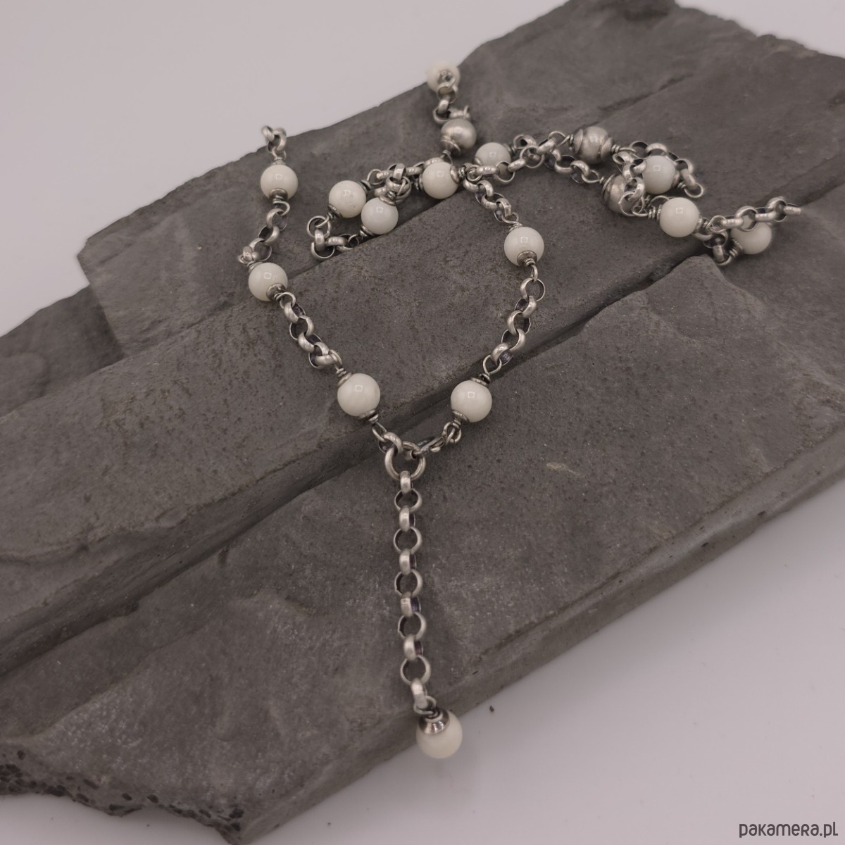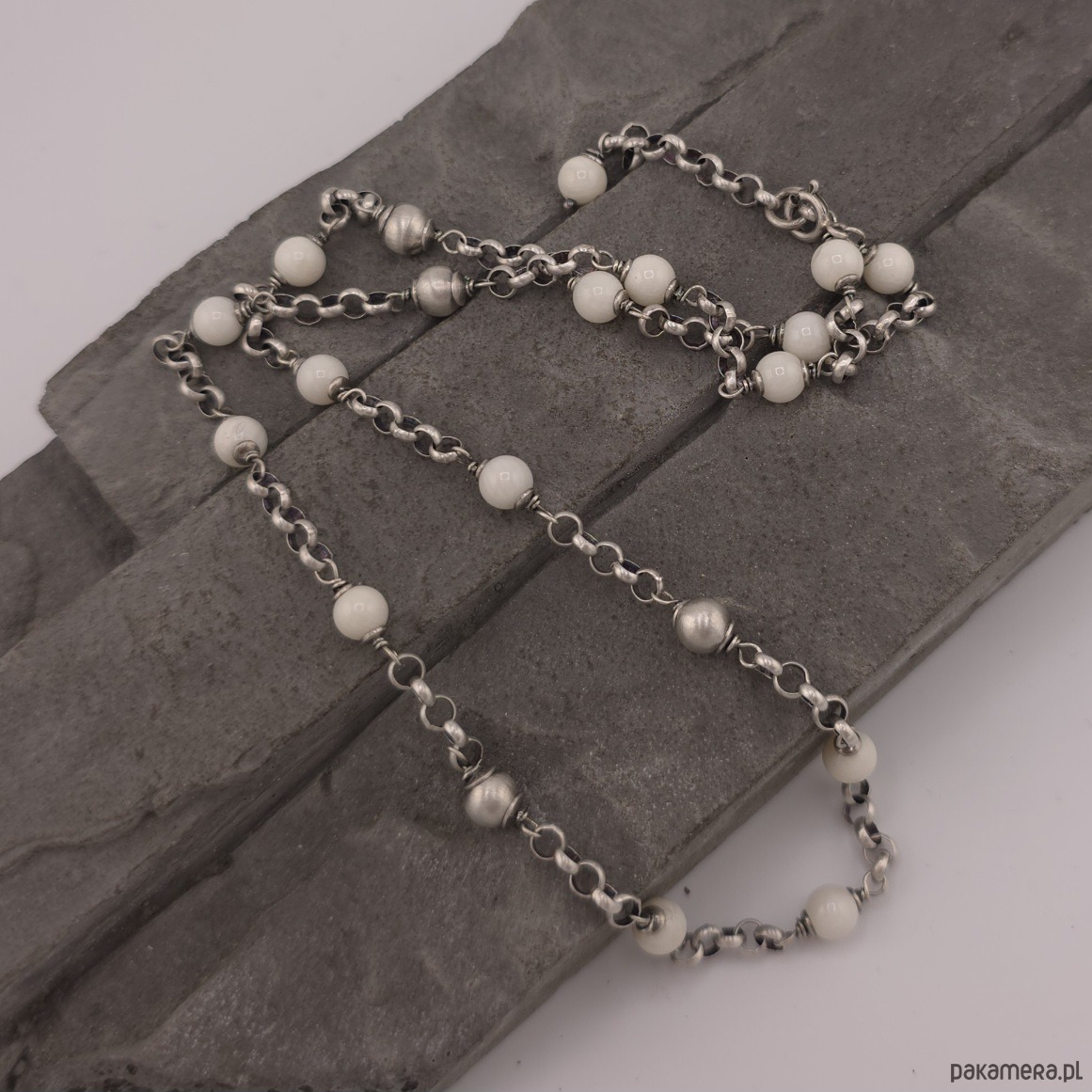 Kobiecy uniwersalny naszyjnik na każdą okazję. Wykonany w całości z oksydowanego srebra próby 925 oraz kulek białego korala wielkości ok. 0,6 cm. Solidny łańcuszek grubosci 3,8 mm. Całkowita długość naszyjnika to ok. 51 cm plus 3 cm regulacji. Mozna nosic jako korale lub z wisiorkiem z przodu. Moge wykonac identyczny z innymi kamieniami. W mojej galerii bransoletka do kompletu. Ozdobnie zapakowany.