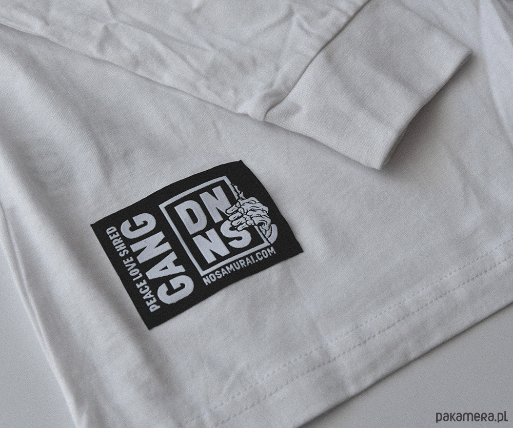 Z tyłu naszywka żakardowa PEACE LOVE SHRED GANG z ręką świeżo po wyjęciu z kwasu, dzierżącą logotyp DNNS.