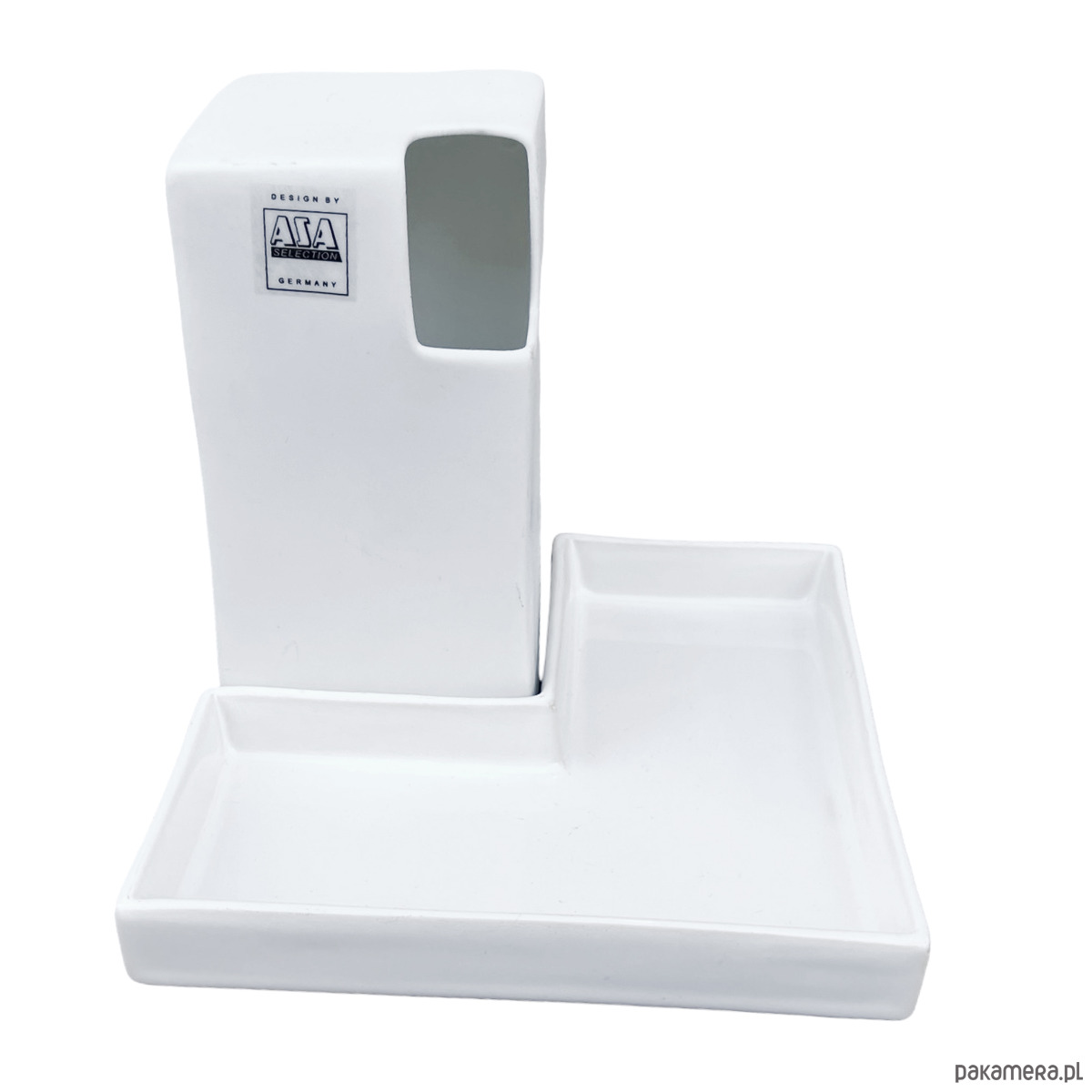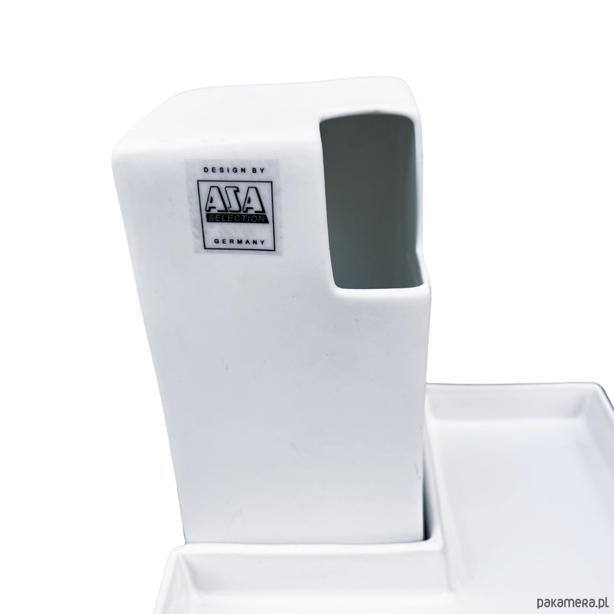 Dekoracyjny wazon ceramiczny wyprodukowanu przez niemiecką firmę Asa. Piękny, minimalistyczny przedmiot wykonany z białej ceramiki. Sygnowany. Oryginalny przedmiot vintage pochodzący z lat osiemdziesiątych XX wieku. Stan zachowania idealny, praktycznie nie nośi śladów użytkowania. Piękny, stylowy, niezwykły, matowobiały, prostokątny wazon ceramiczny z kolekcji ASA. Oznaczenia na podstawie: Ręcznie wykonany wzór ASA i wybór ASA na etykiecie.
