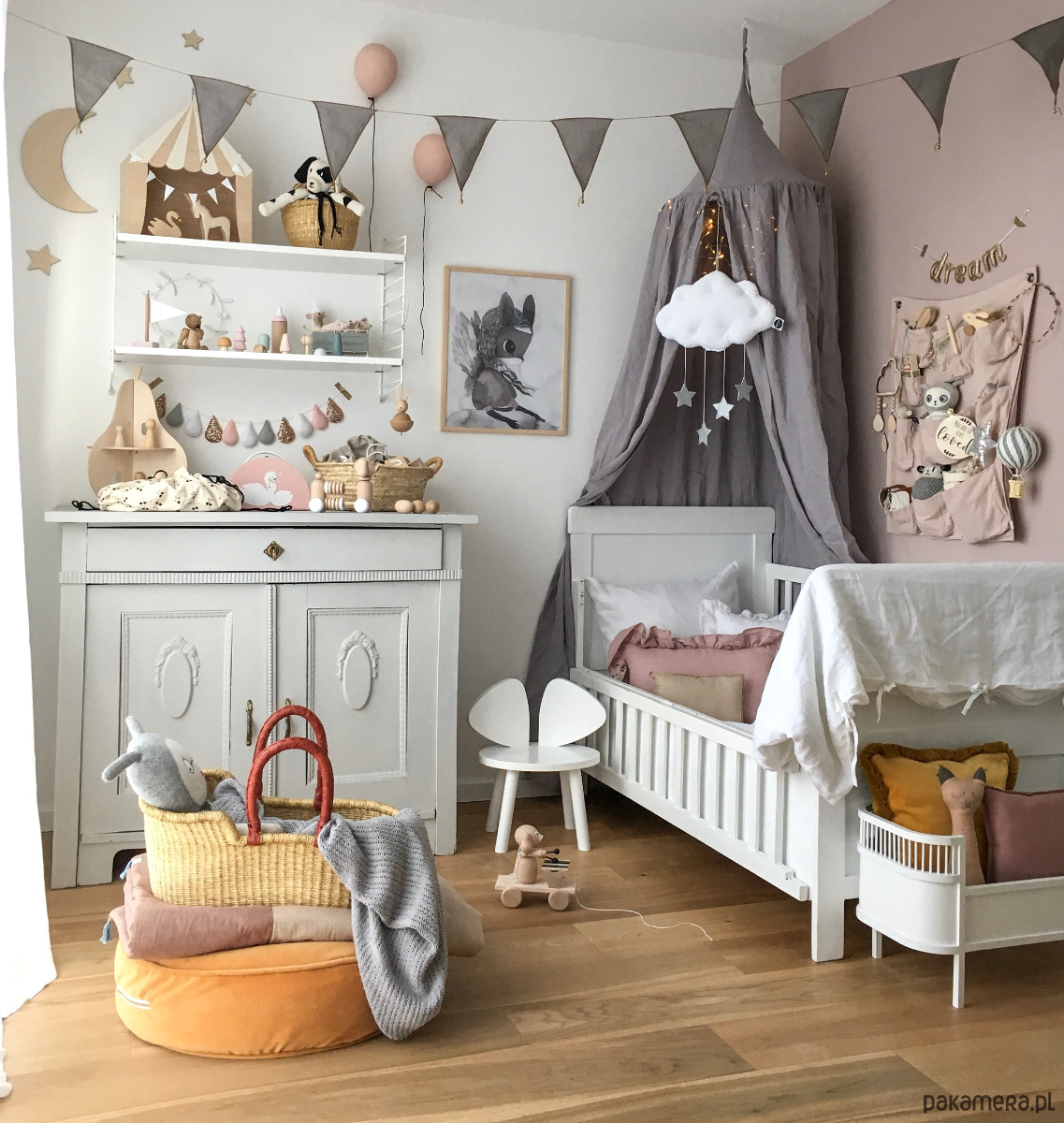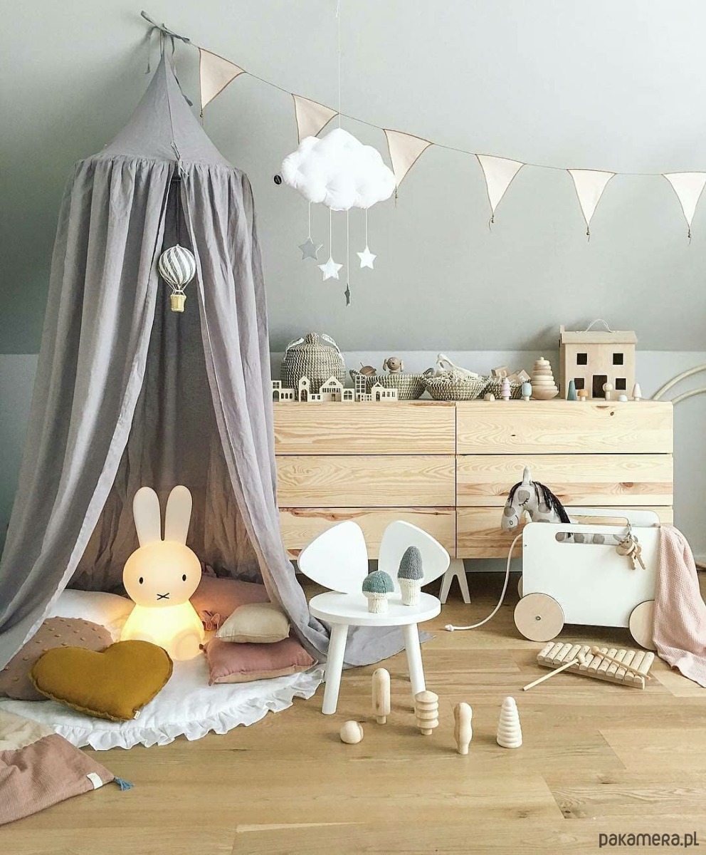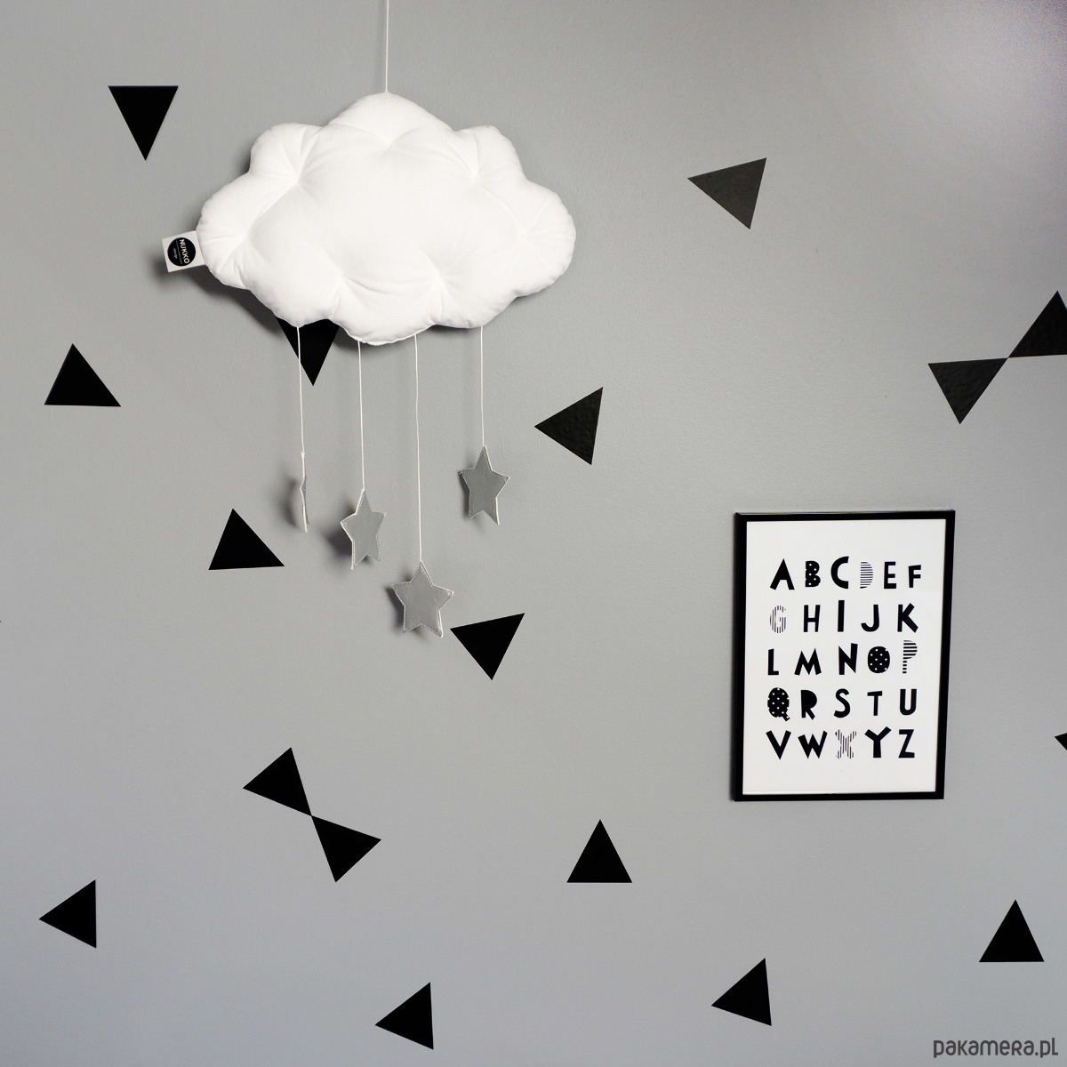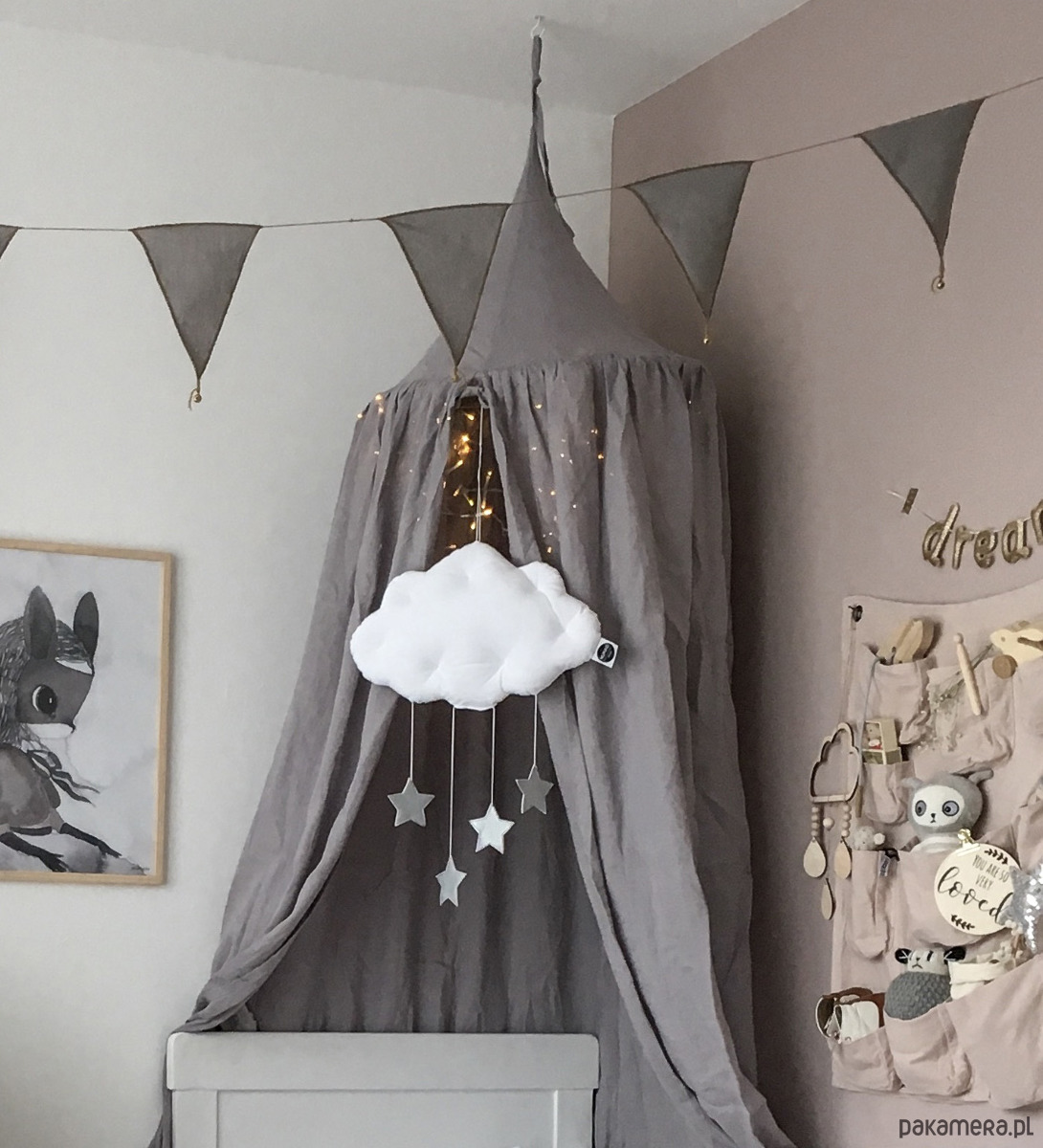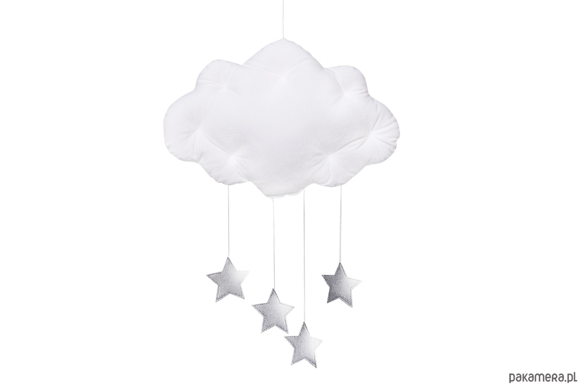 Mobil chmurka Velvet ze srebrnymi metalicznymi gwiazdkami doda uroku każdemu wnętrzu. Znajdzie swoje miejsce pod baldachimem, nad łóżeczkiem lub ozdobi ścianę pokoiku dziecka. Jest to niezwykły element dekoracyjny, który dopełni aranżację pokoiku malucha i rozbudzi jego wyobraźnie.