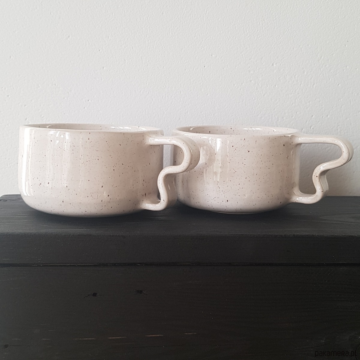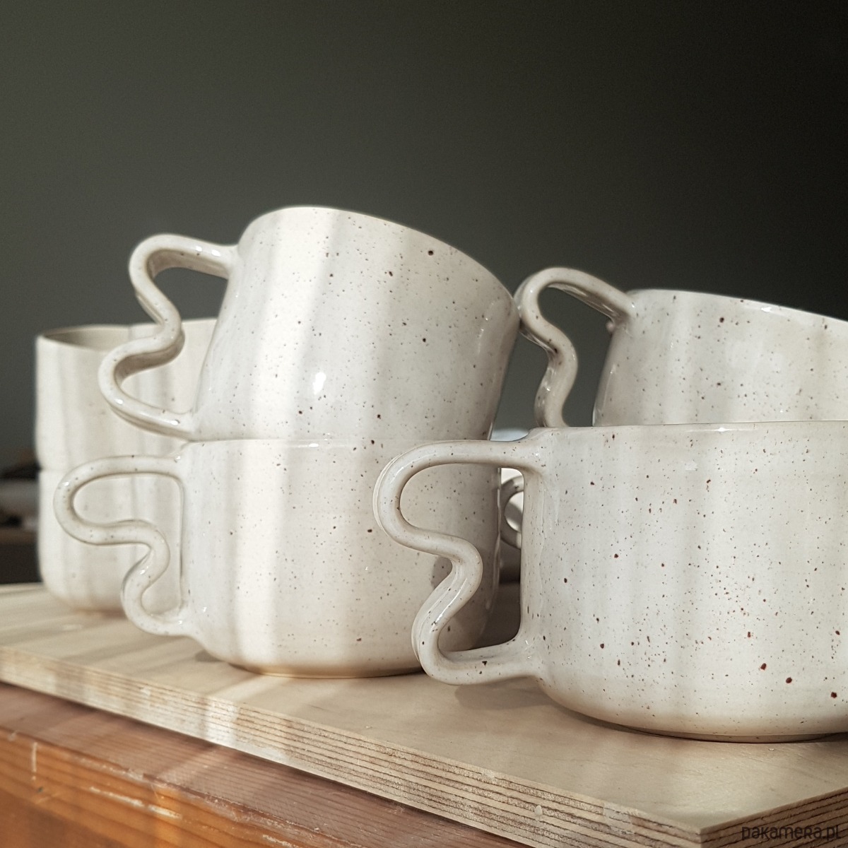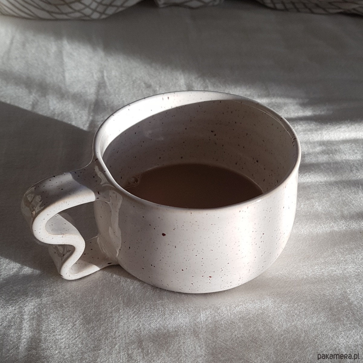 Biały kubek nakrapiany z wygiętym uszkiem.