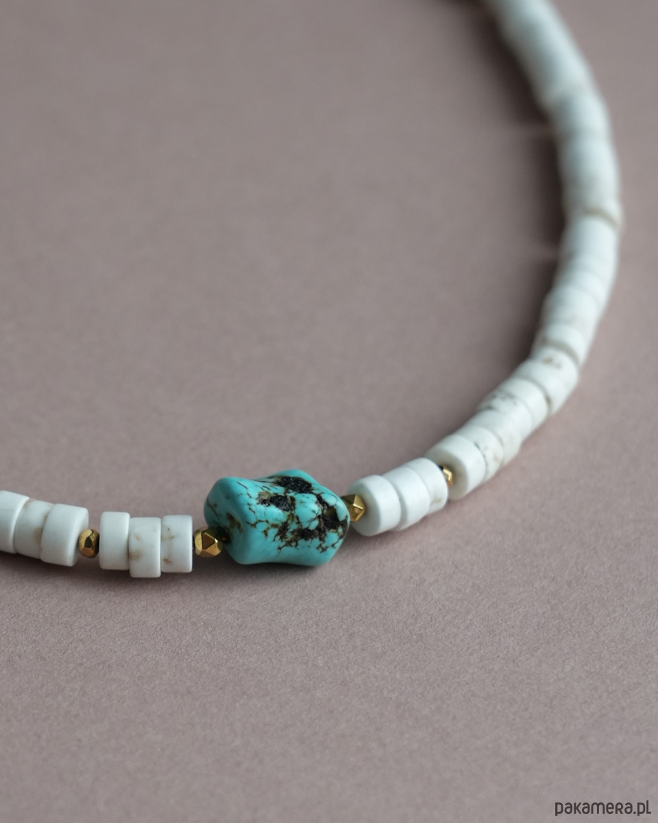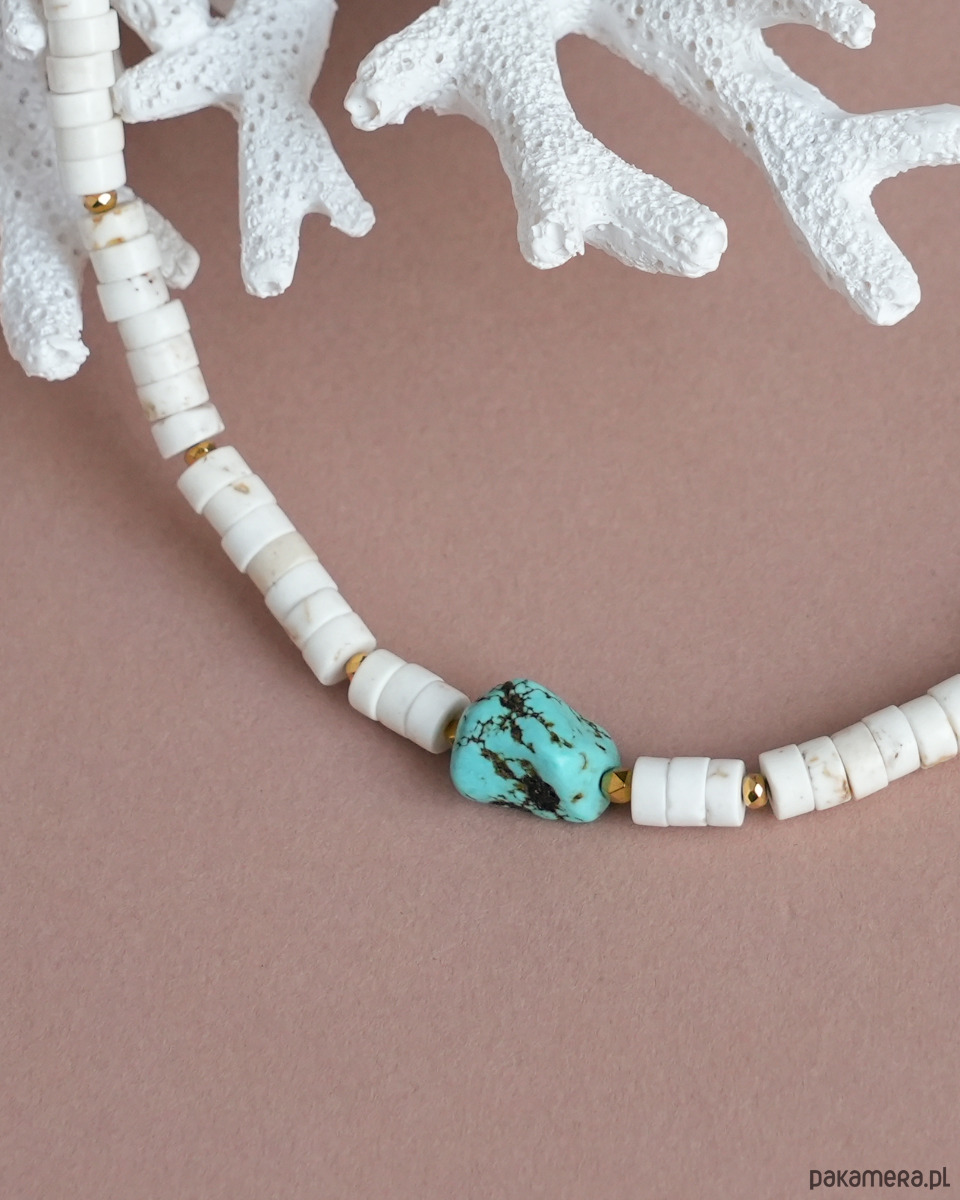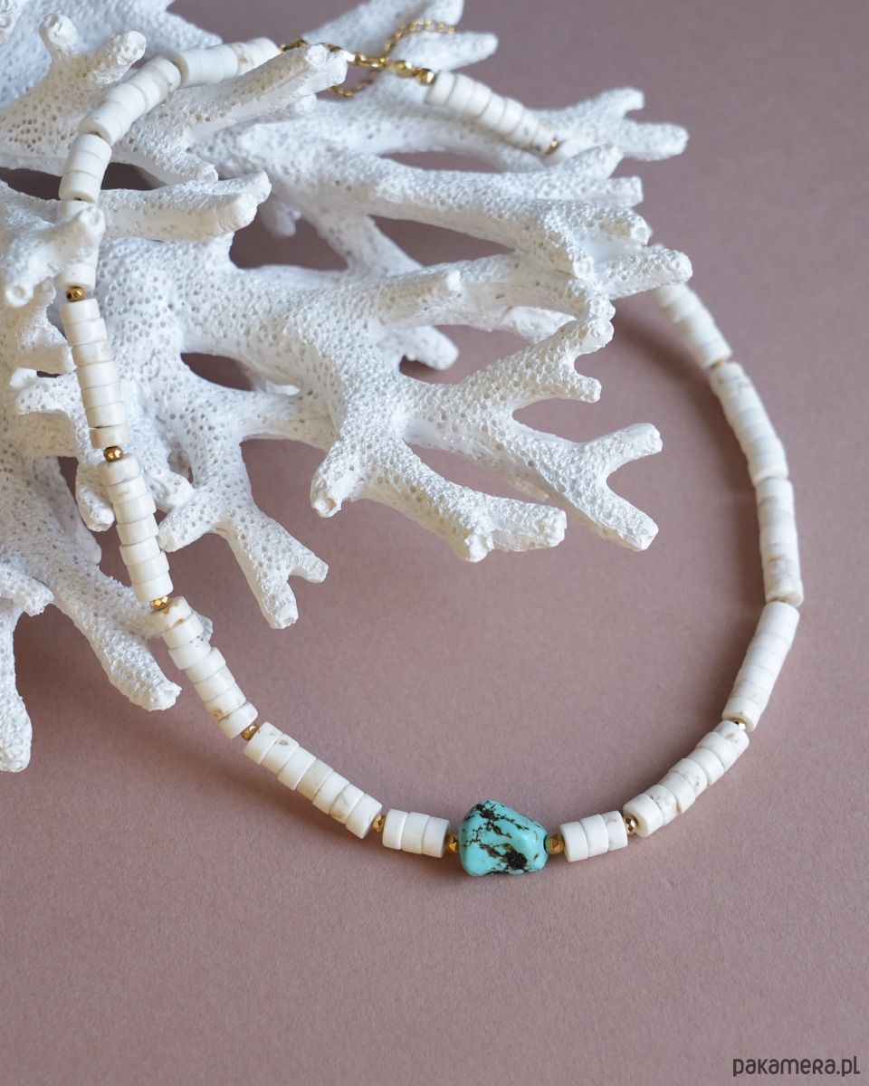 Naszyjnik na lato z białego HOWLITU i złotego HEMATYTU. Kamień na środku przypominający turkus to również HOWLIT barwiony na niebiesko. Zapięcie i łańcuszek to STAL SZLACHETNA w kolorze złotym.