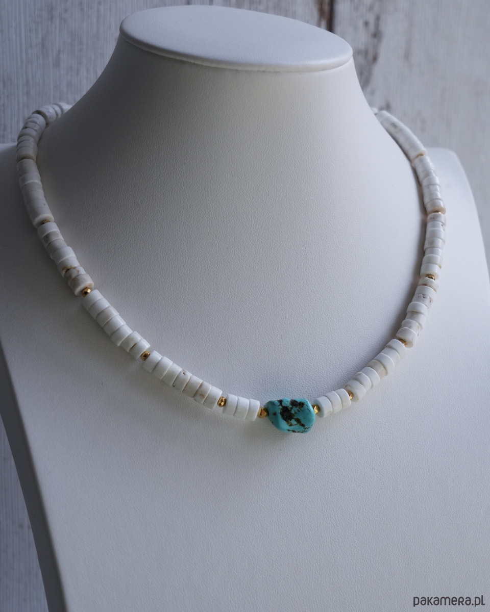 Naszyjnik można nosić solo, jak i w połączeniu z innymi naszyjnikami lub złotymi łańcuszkami i wisiorkami różnej długości, ułożonymi kaskadowo. Biały kolor będzie pięknie podkreślał wakacyjną opaleniznę.