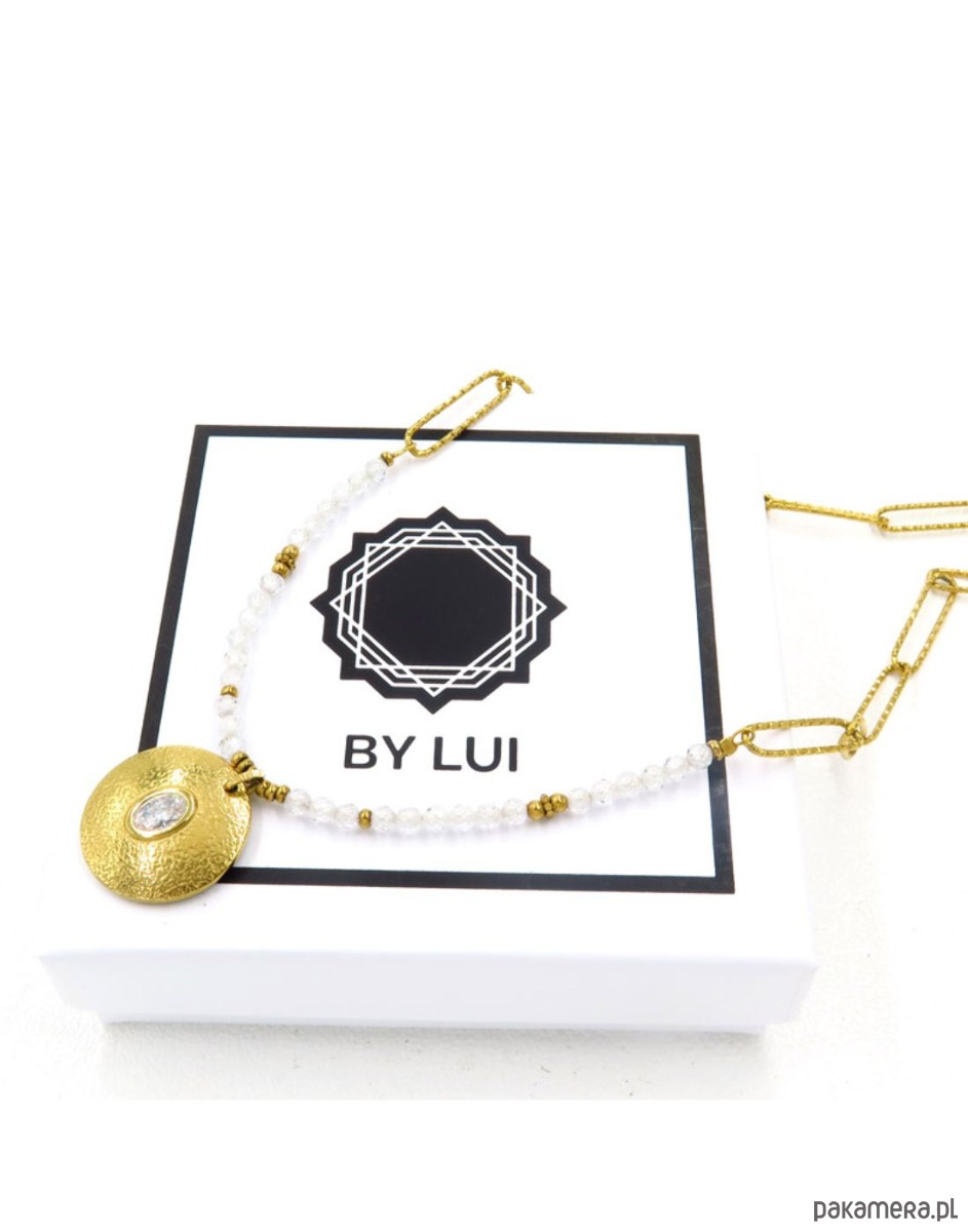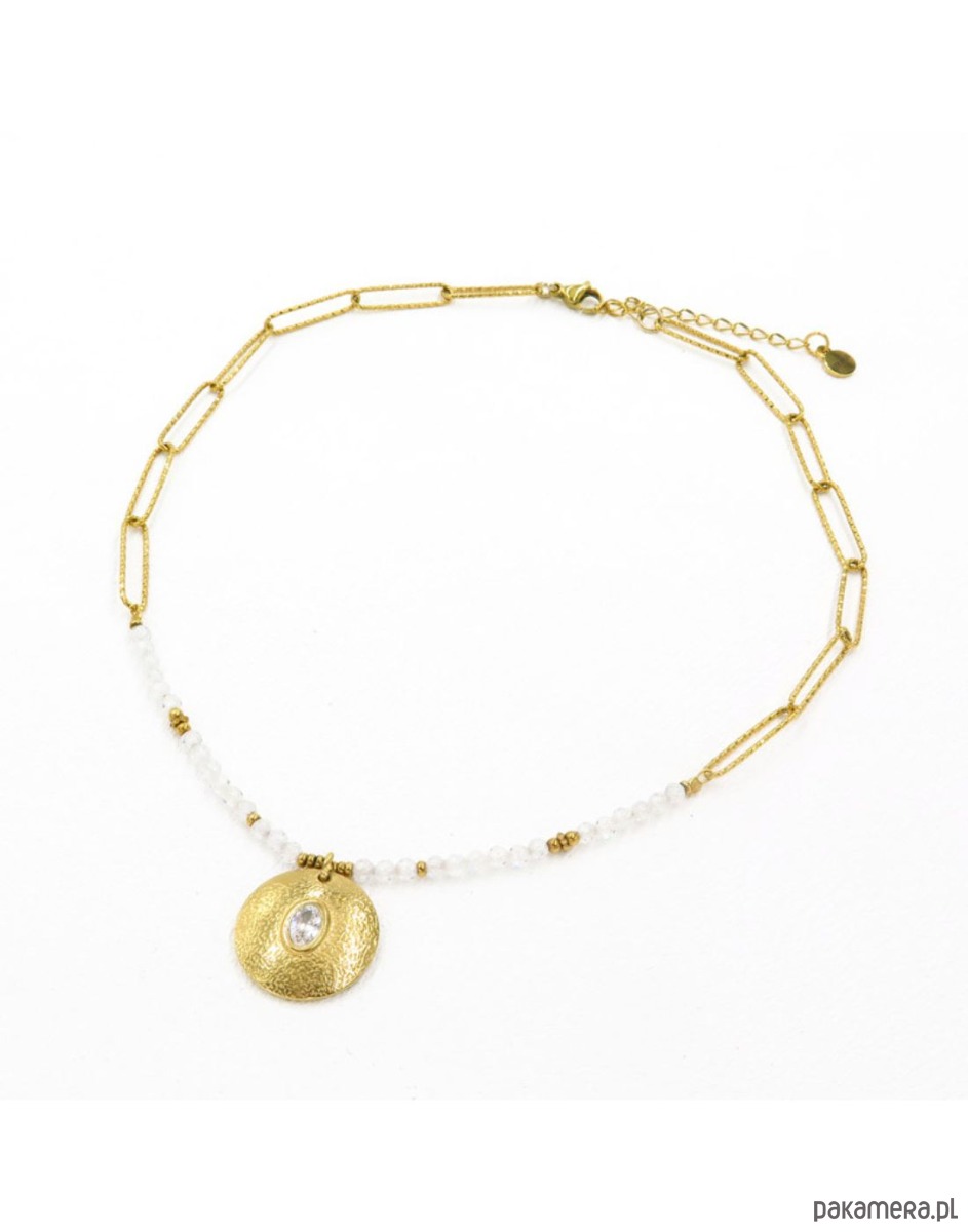 Złoty naszyjnik handmade z fasetowanych cyrkonii i zawieszką z owalnym oczkiem to elegancka biżuteria, która pięknie odbija światło i dodaje blasku każdej stylizacji. Diamentowany łańcuszek z prostokątnymi ogniwami i regulacją sprawia, że to idealny dodatek na co dzień i na wyjątkowe okazje. Centralna zawieszka z fakturowanego złotego krążka została ozdobiona owalną cyrkonią, dodając biżuterii nutę eleganckiej ekstrawagancji. Ten naszyjnik jest jak świetlisty akcent – idealny do minimalistycznych stylizacji lub jako błyszczący detal do sukienki na wieczór.