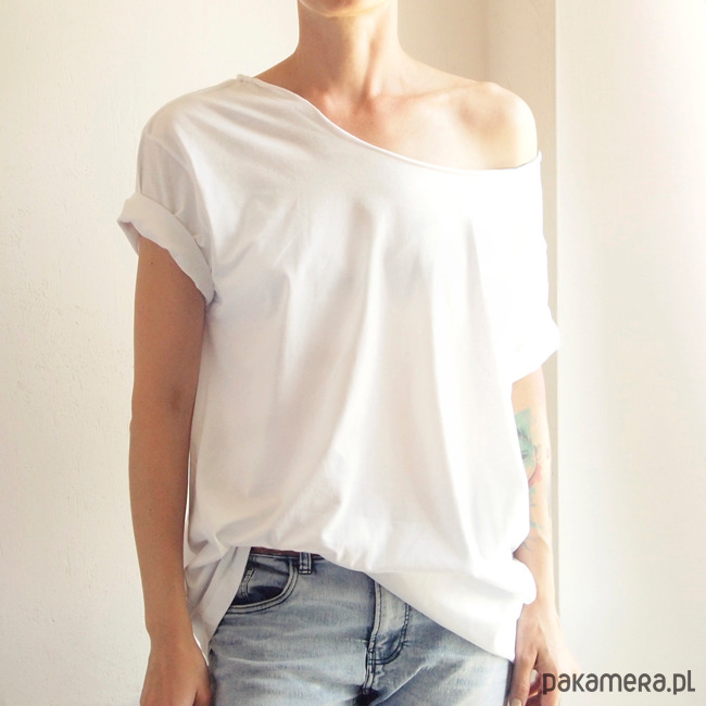 Biała, nonszalancka koszulka z ciętym dekoltem. Opadający dekolt, zsuwa się z ramienia.
