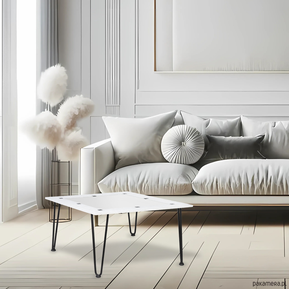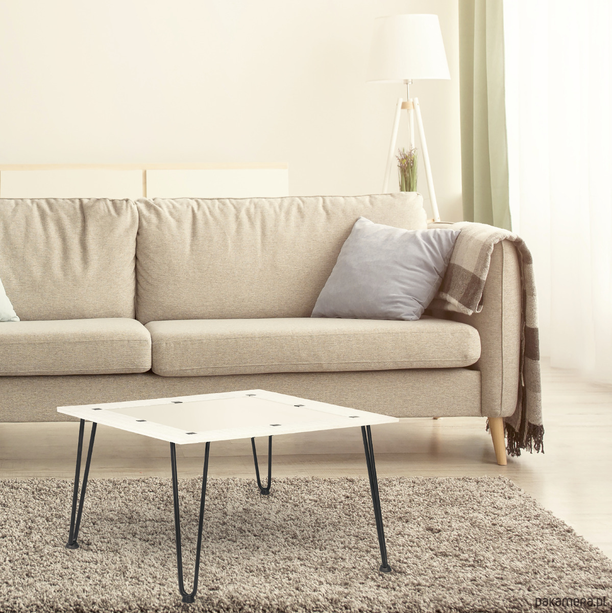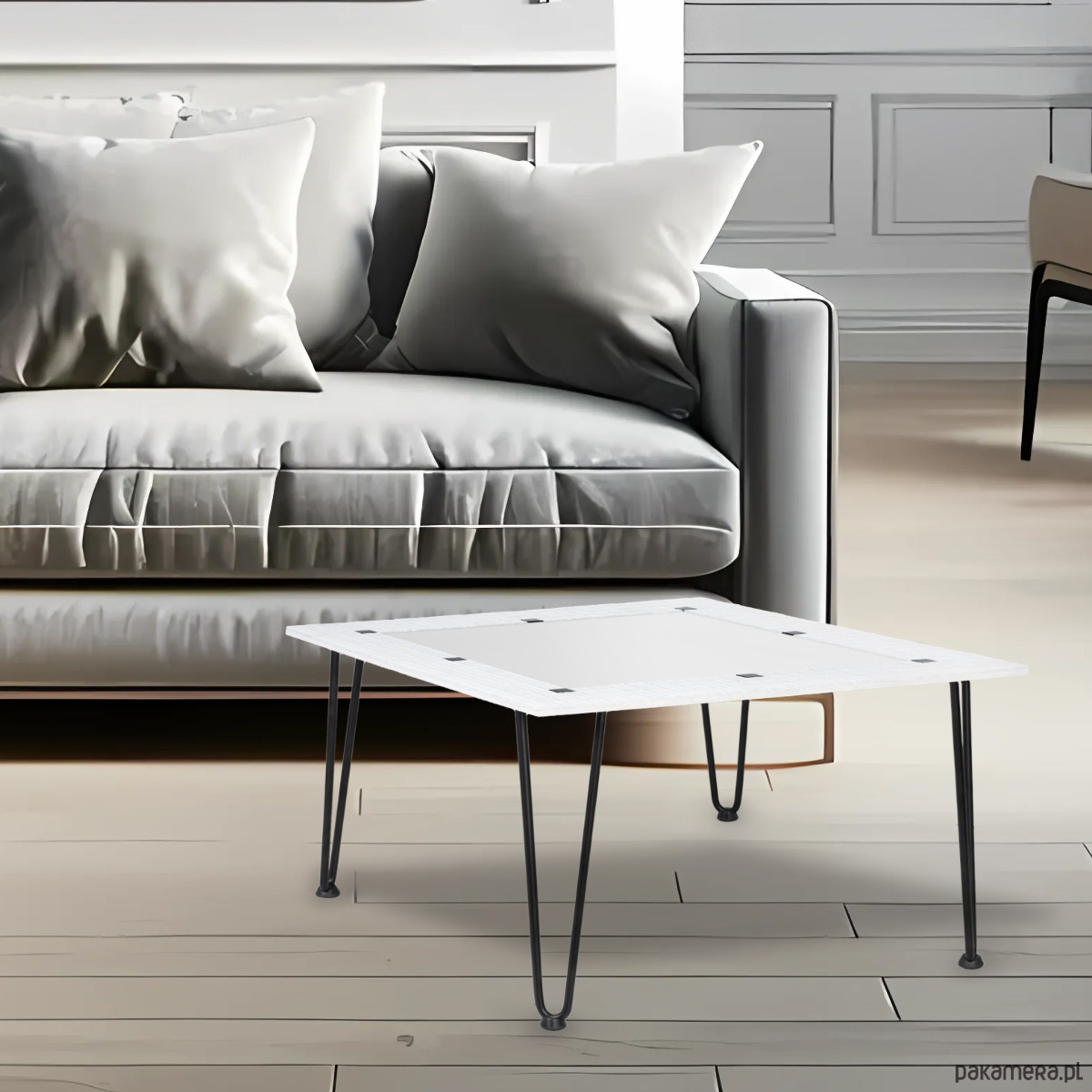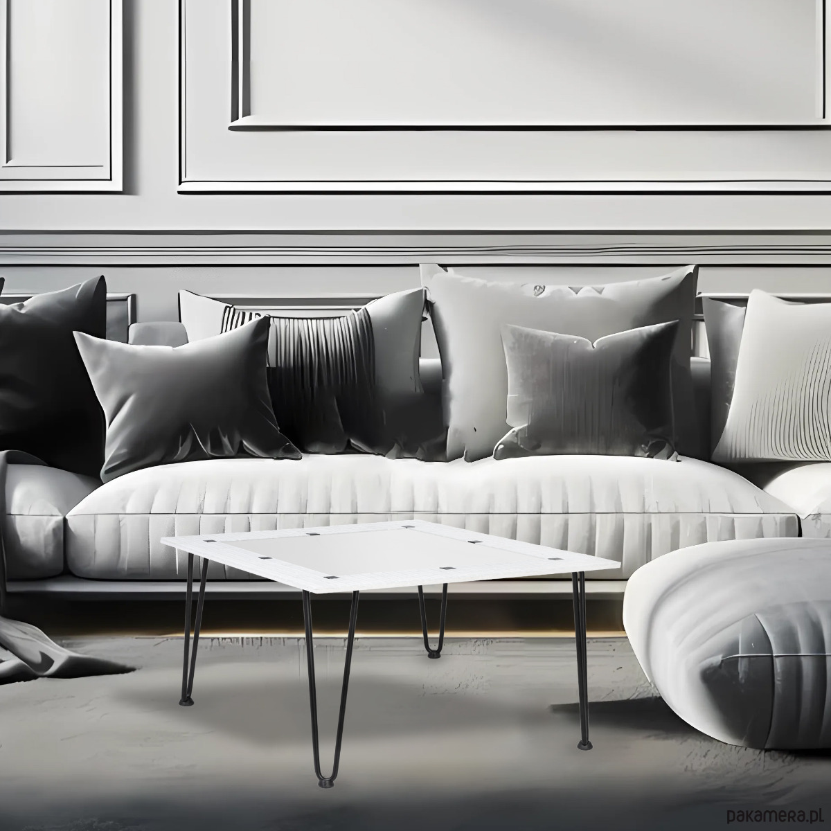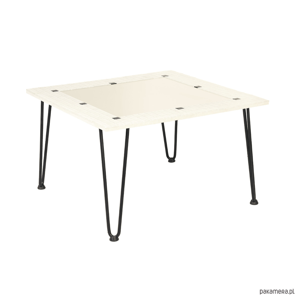 Stolik kawowy, kwadratowy Salvi zdobiony białą, szklaną mozaiką z czterema metalowymi nogami typu hairpin
