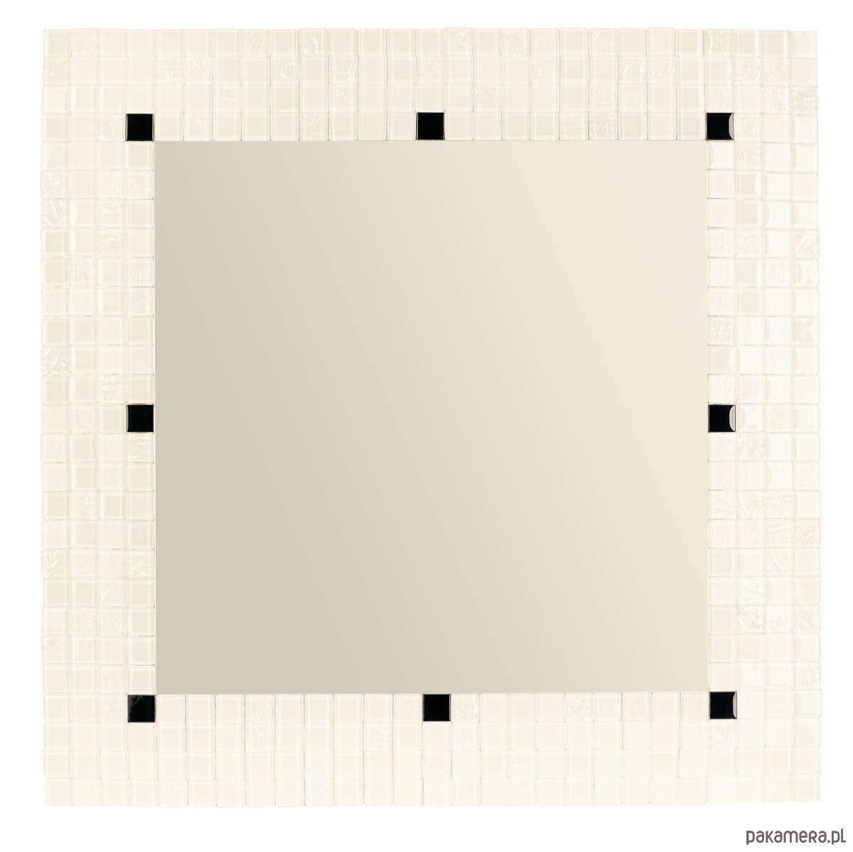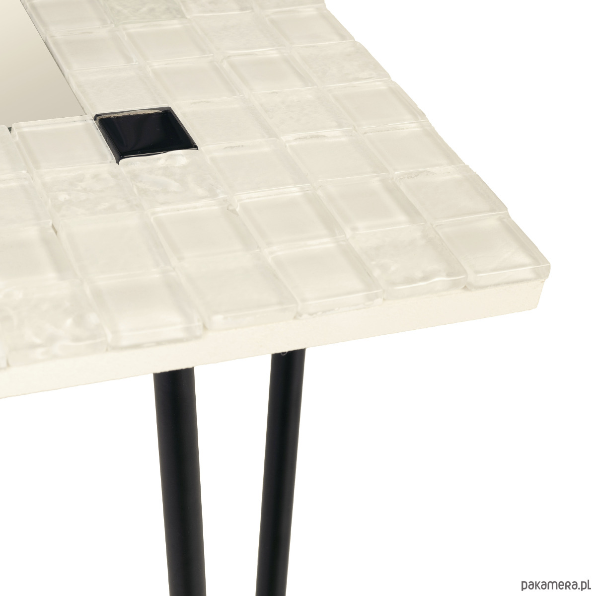 Biała mozaika o strukturze mrożonego szkła z gładką białą mozaiką tworzy nierównomierną, bogatą powierzchnię, zachowując jednocześnie oryginalny, wyjątkowy charakter. Czarne kostki przełamują biel i wyraźnie zaznaczają granice wewnętrznego obrysu lustra. Blat stolika umieszczony na 4 metalowych nogach.
