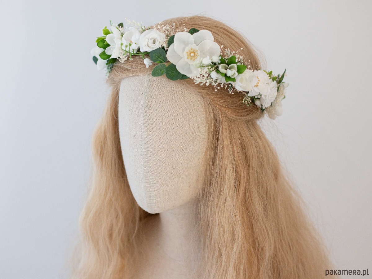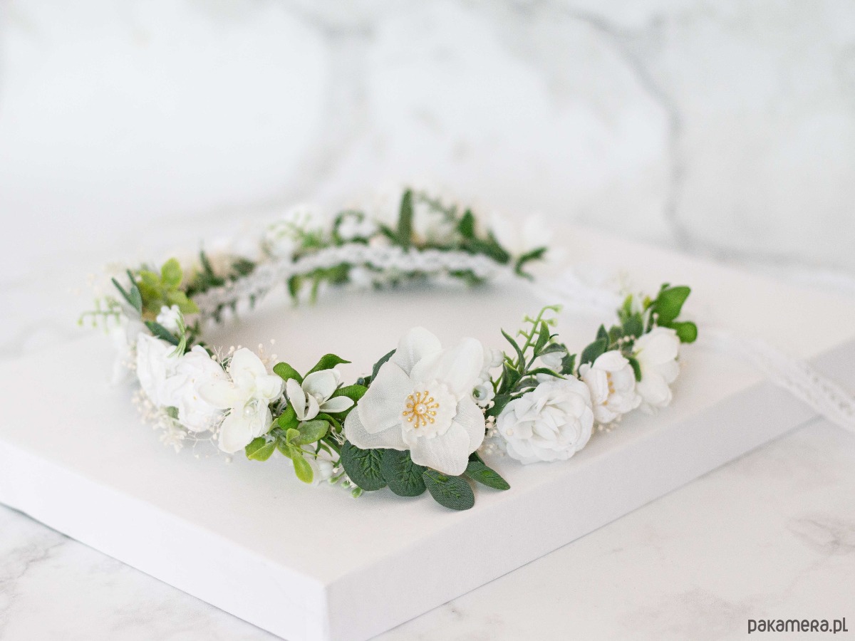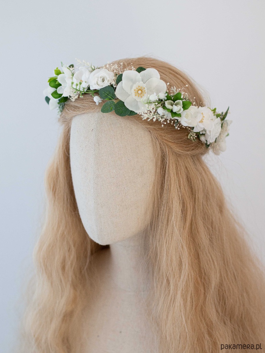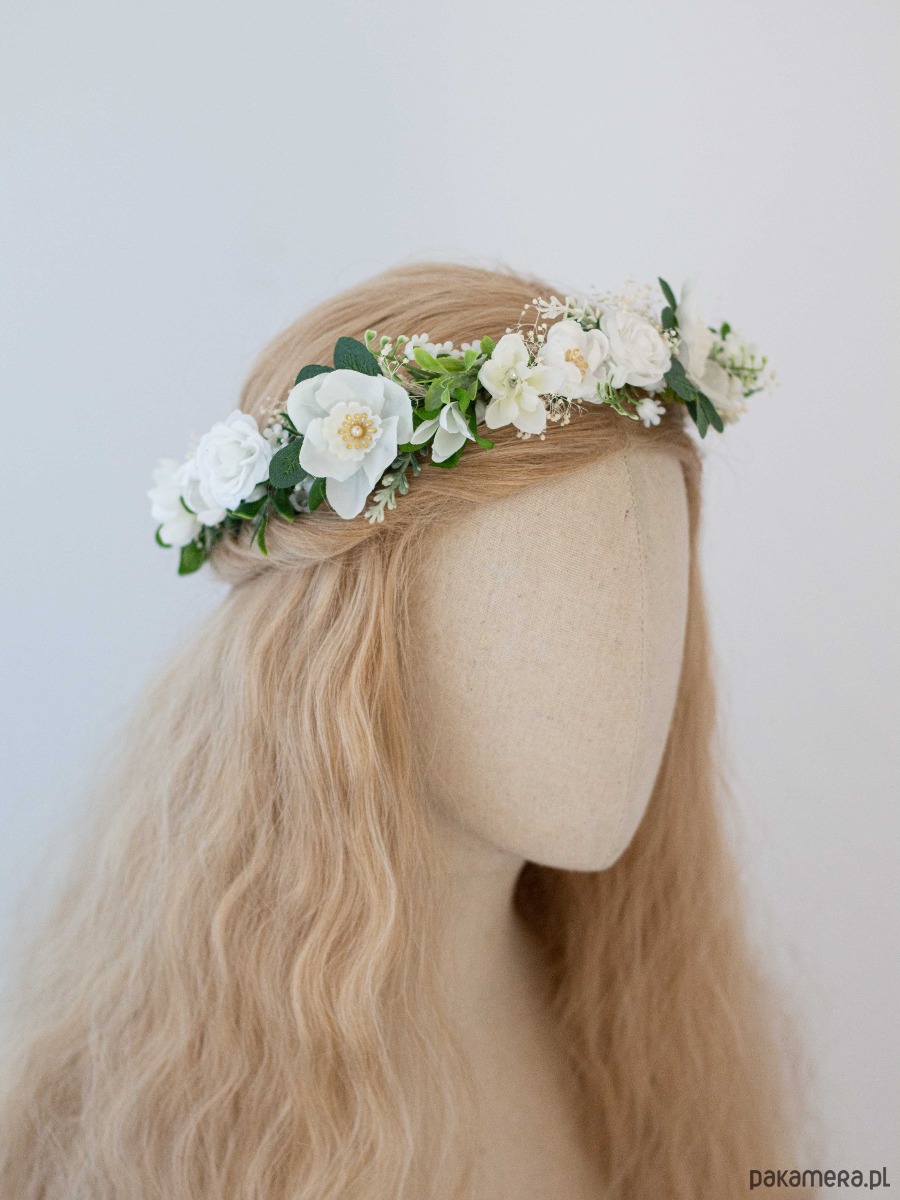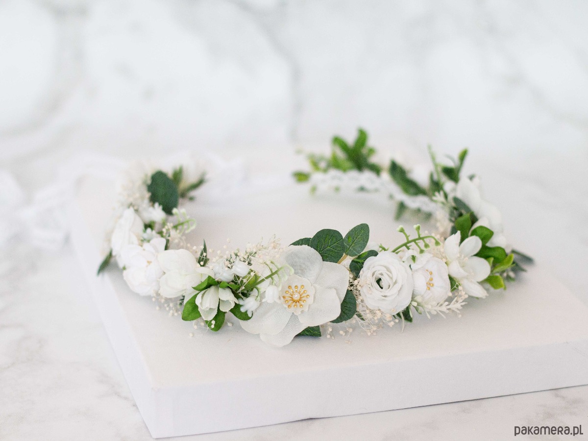Romantyczny wianek na głowę, zdobiony syntetycznymi kwiatami i listkami. Suszona gipsówka dodaje kompozycji lekkości. Możliwość regulacji wielkości obwodu, dzięki koronkowej tasiemce z tyłu. Będzie pasował zarówno na głowę dziecka, jak i osoby dorosłej. Ozdoba będzie idealna na Pierwszą Komunię Świętą. Wianek wykonany ręcznie, z najwyższą starannością, w pracowni "Lola White" w Polsce.