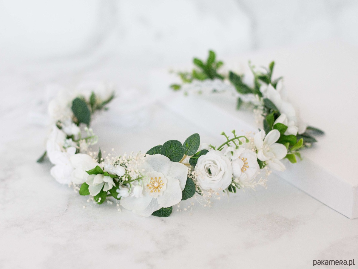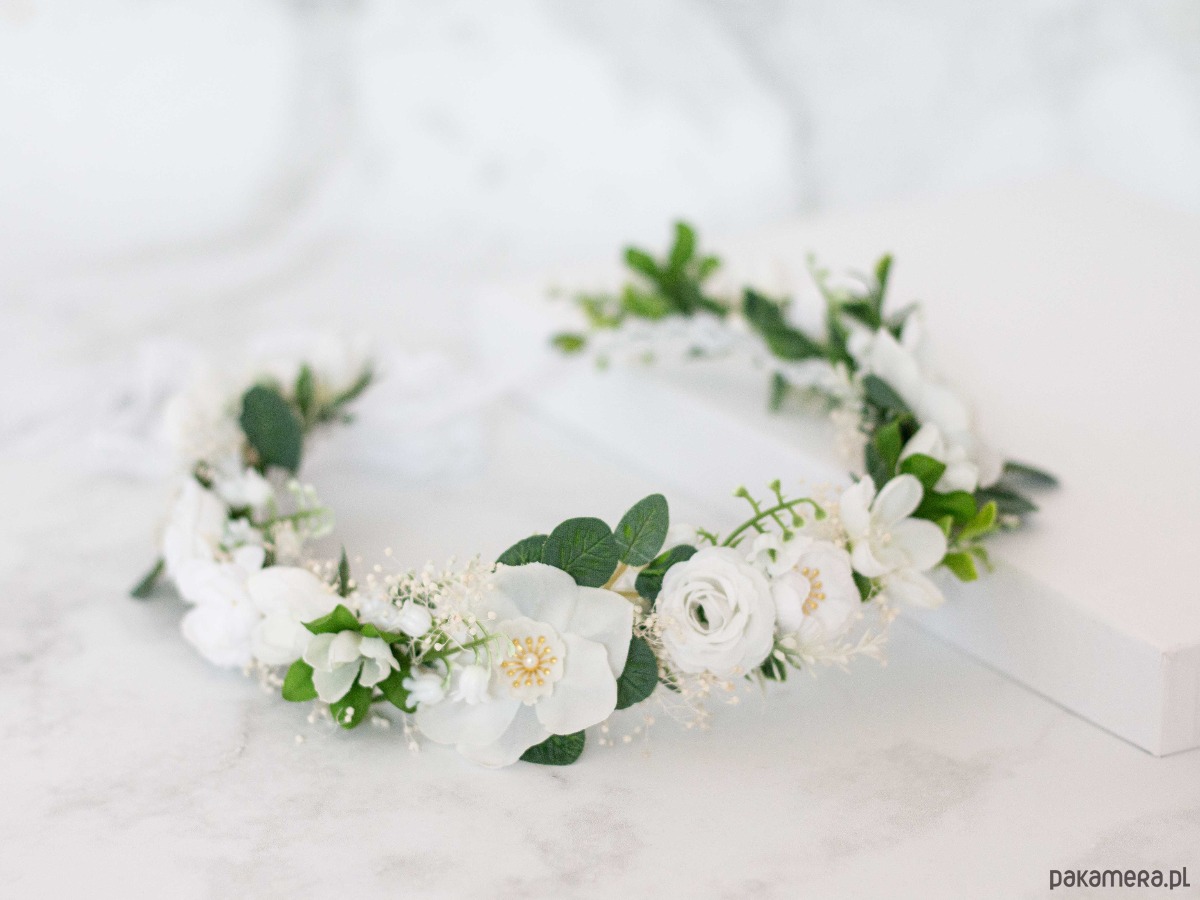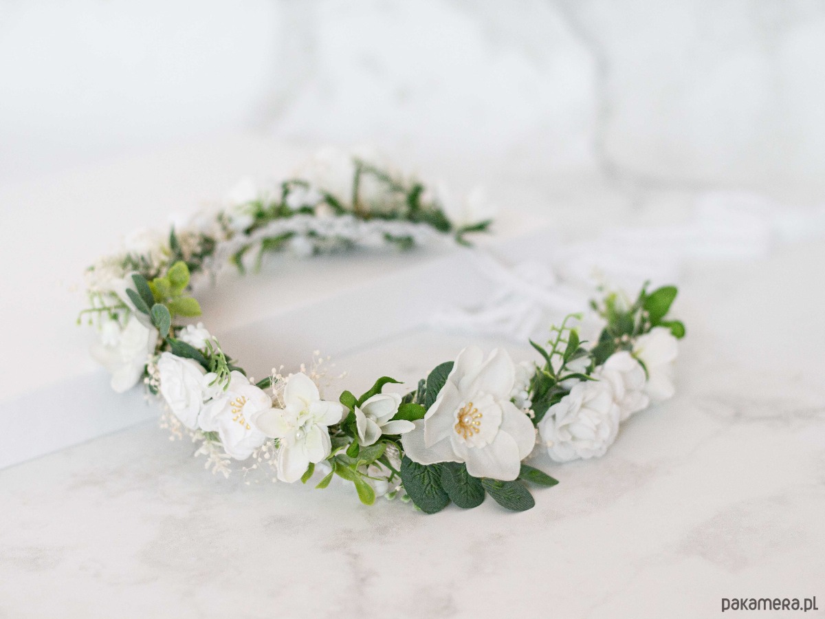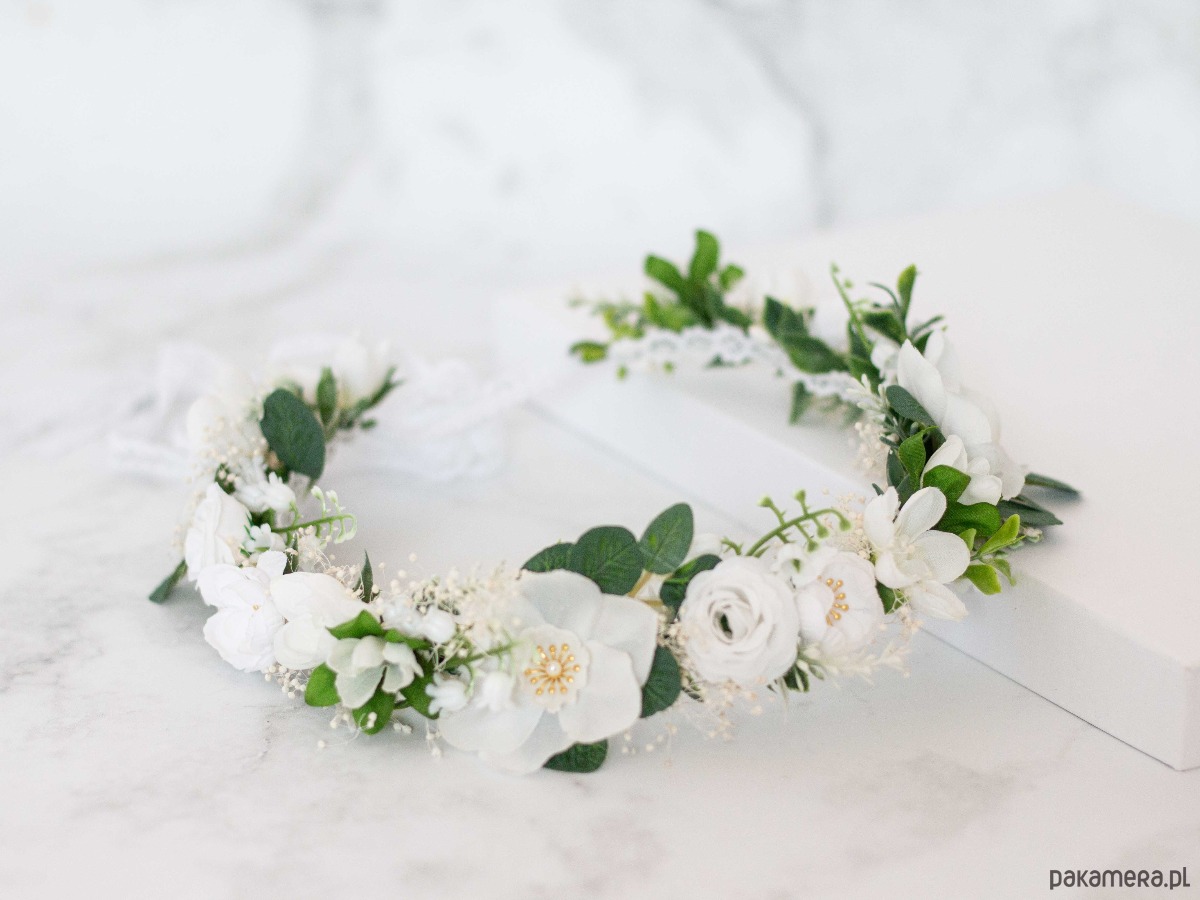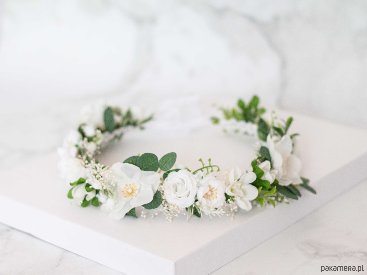 Romantyczny wianek na głowę, zdobiony syntetycznymi kwiatami i listkami. Suszona gipsówka dodaje kompozycji lekkości. Możliwość regulacji wielkości obwodu, dzięki koronkowej tasiemce z tyłu. Będzie pasował zarówno na głowę dziecka, jak i osoby dorosłej. Ozdoba będzie idealna na Pierwszą Komunię Świętą. Wianek wykonany ręcznie, z najwyższą starannością, w pracowni "Lola White" w Polsce.