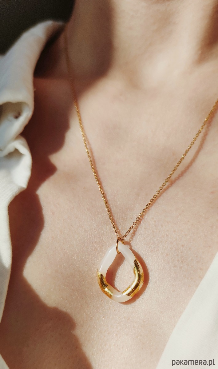 Szklany wisiorek stworzony jest z wytrzymałego szkła borokrzemowego mlecznym kolorze. Powierzchnia szkła pokrywana jest nieregularnym wzorem ze złota płatkowego 23 3/4 ct.