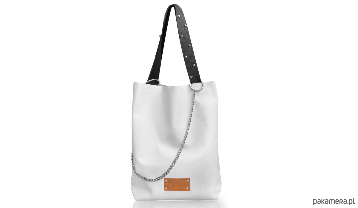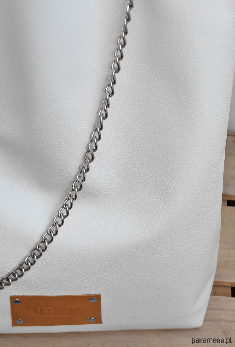 Biały worek na ramię wykonany z wysokiej jakości skóry naturalnej.