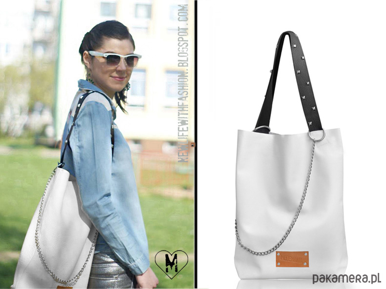 Na froncie metalowy łańcuch i skórzana metka przybita nitami.