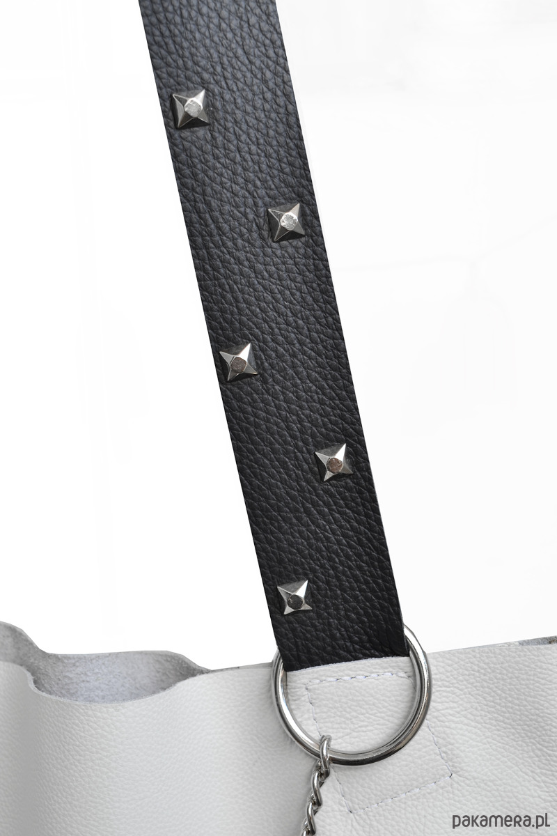 Szeroki skórzany pas na ramię ozdobiony jest metalowymi ćwiekami; jest bardzo wytrzymały i wygodny.