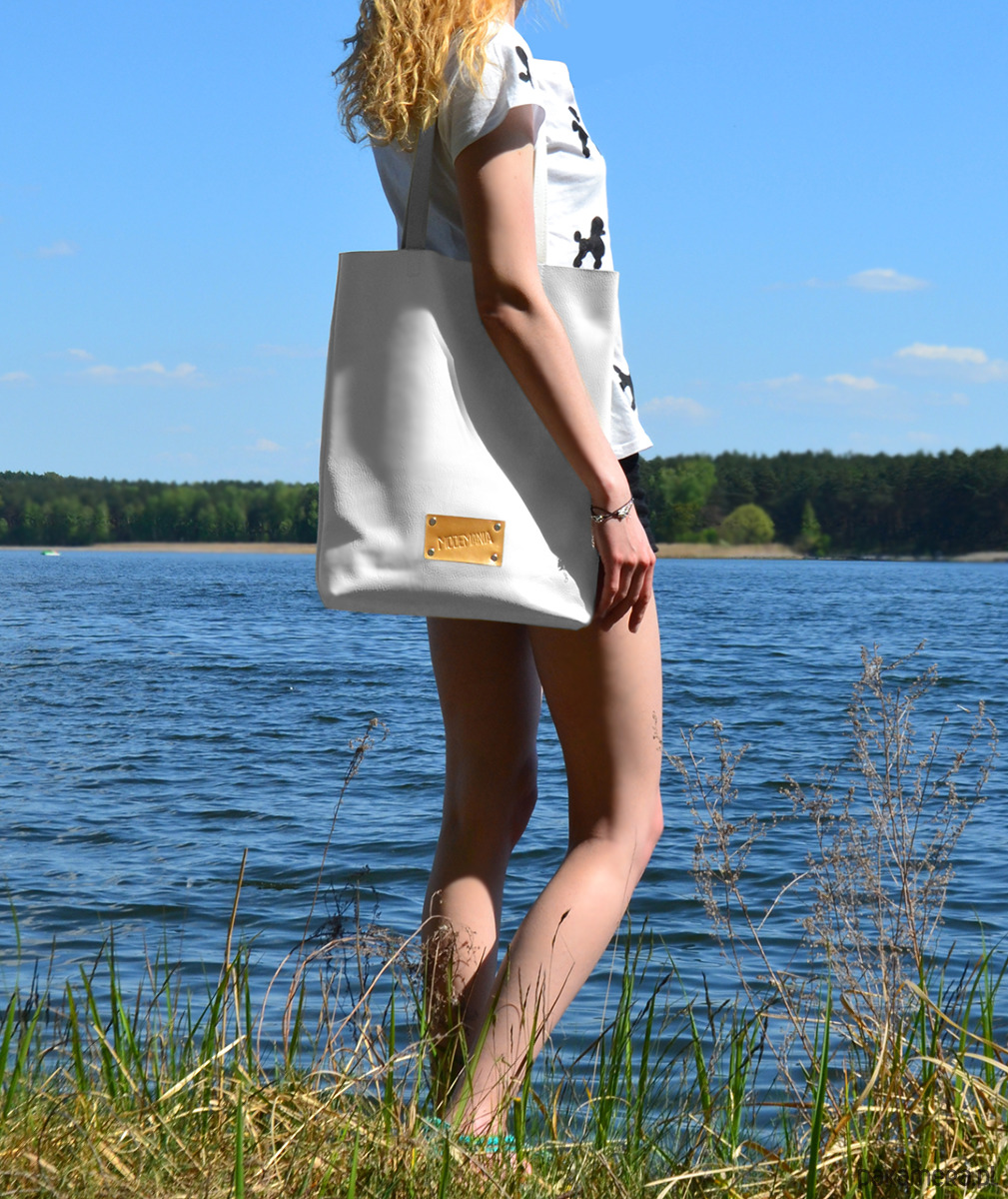 Duży worek na ramię typu shopper w całości wykonany z wysokiej jakości białej skóry naturalnej.