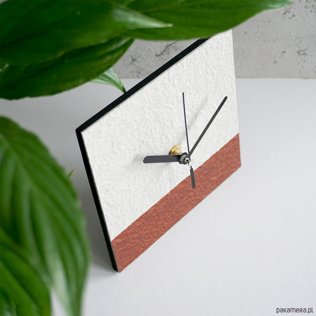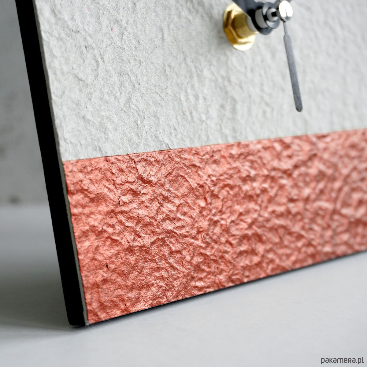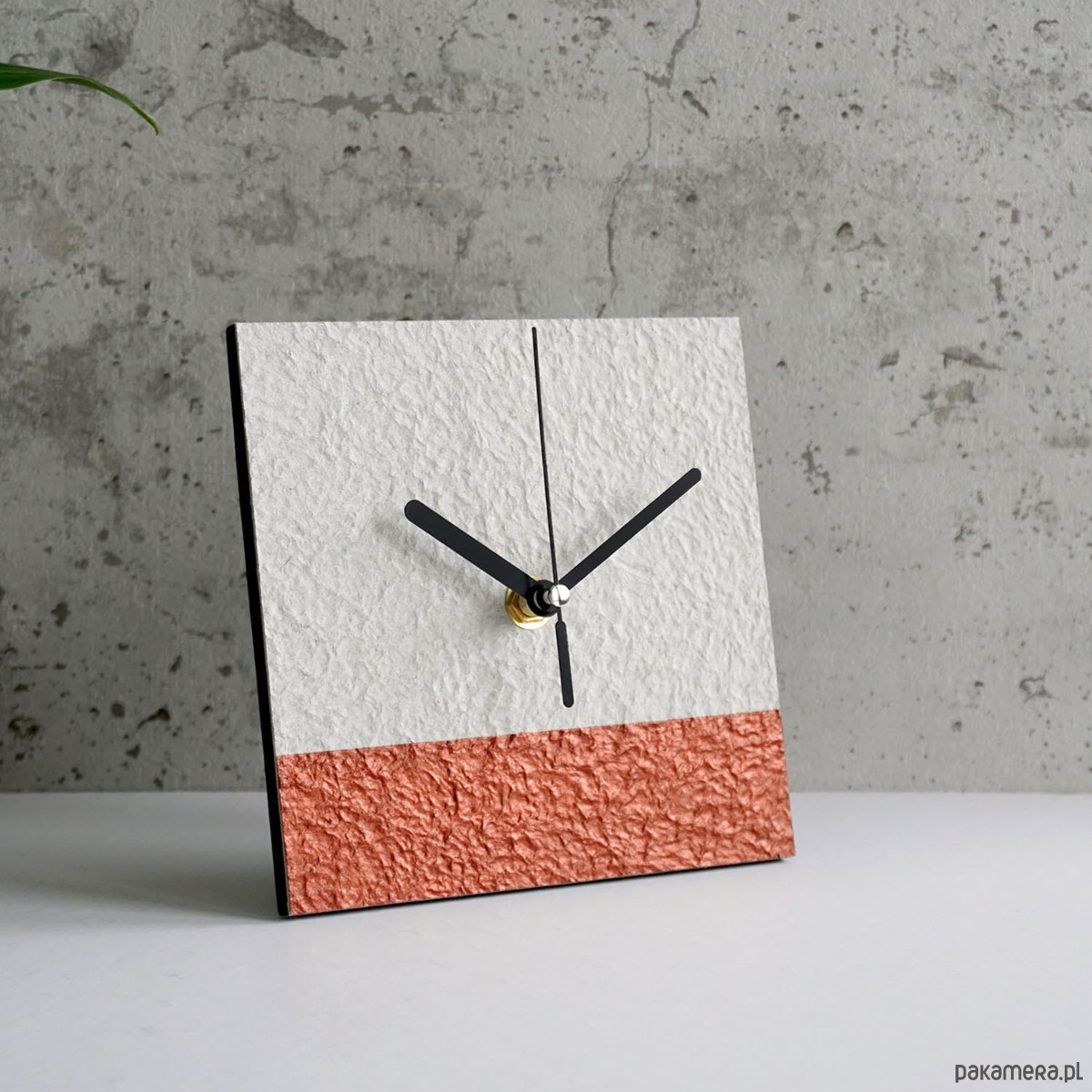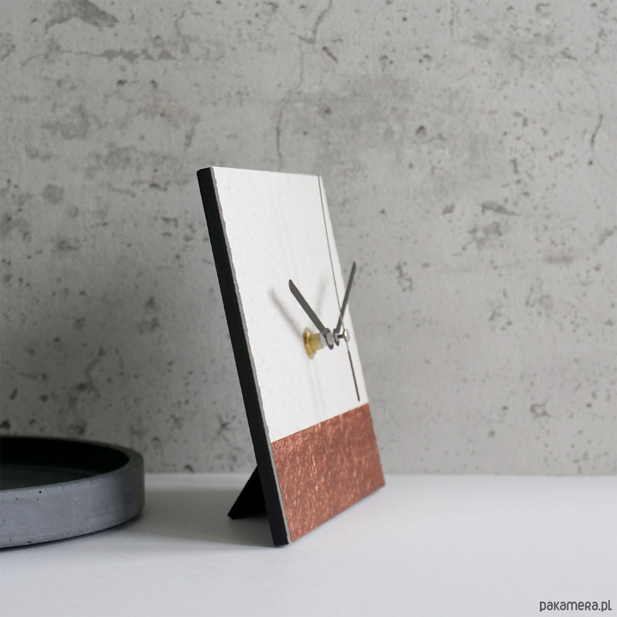 Minimalistyczny zegar stojący do nowoczesnego wnętrza wykonany zgodnie z ideą less waste - z papieru z odzysku.