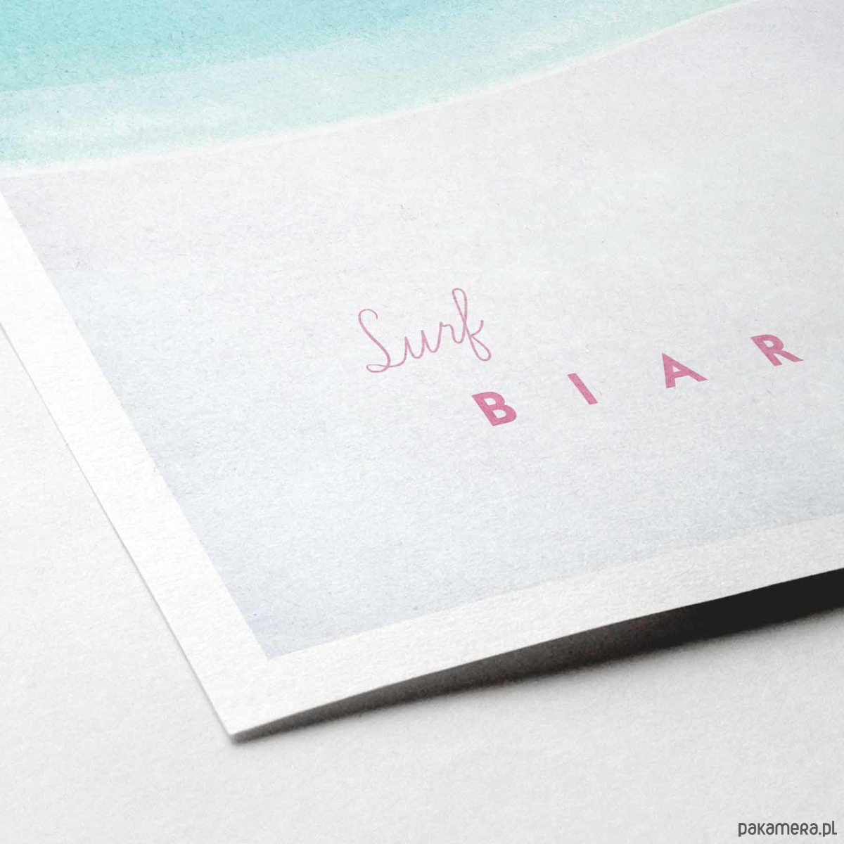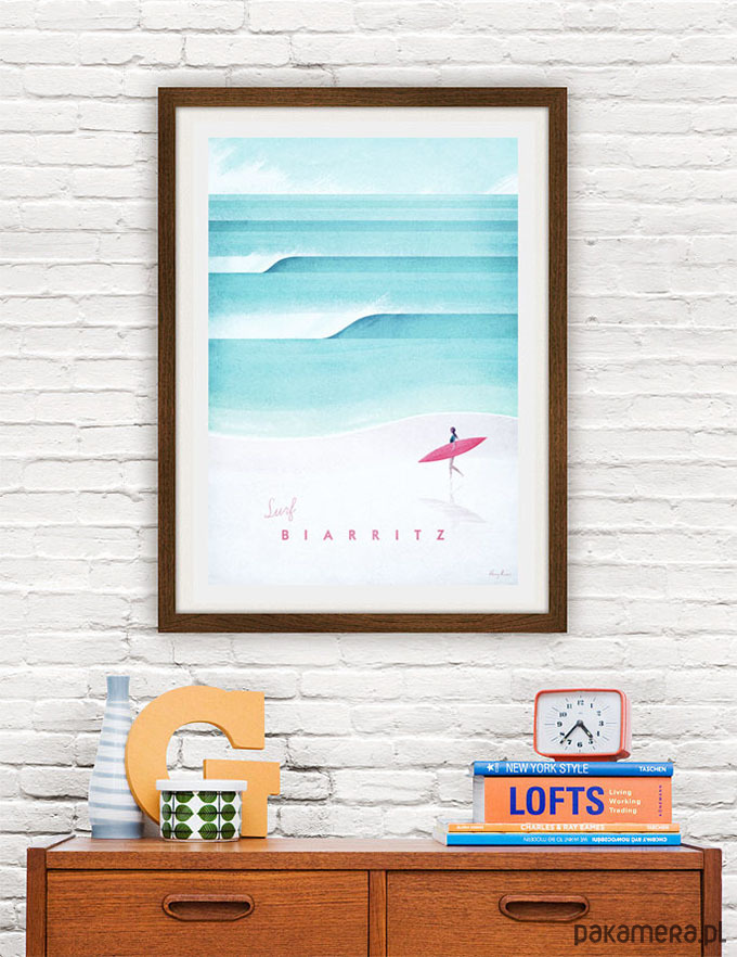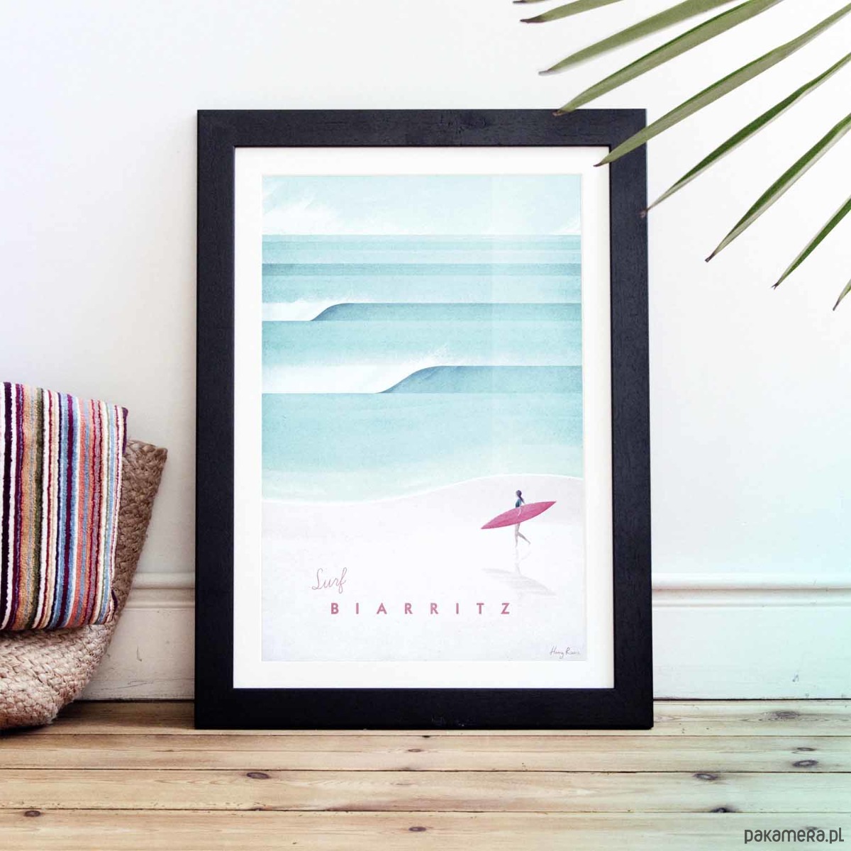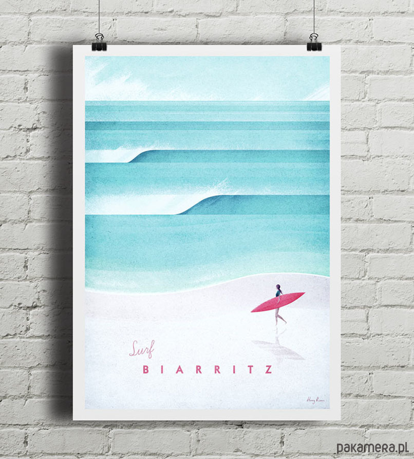 Plakat w stylu vintage przedstawiający surferkę spacerującą po dzikiej plaży przy francuskim miasteczku Biarritz. Doskonałe do surfingu fale złamują się ku wybrzeżu. Na horyzoncie widoczne są niskie chmury. Inspirowany plakatami podróżniczymi z lat 20-tych XX wieku.
