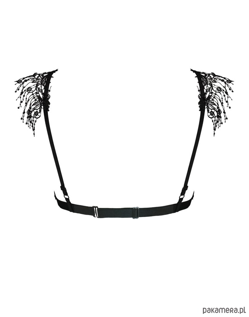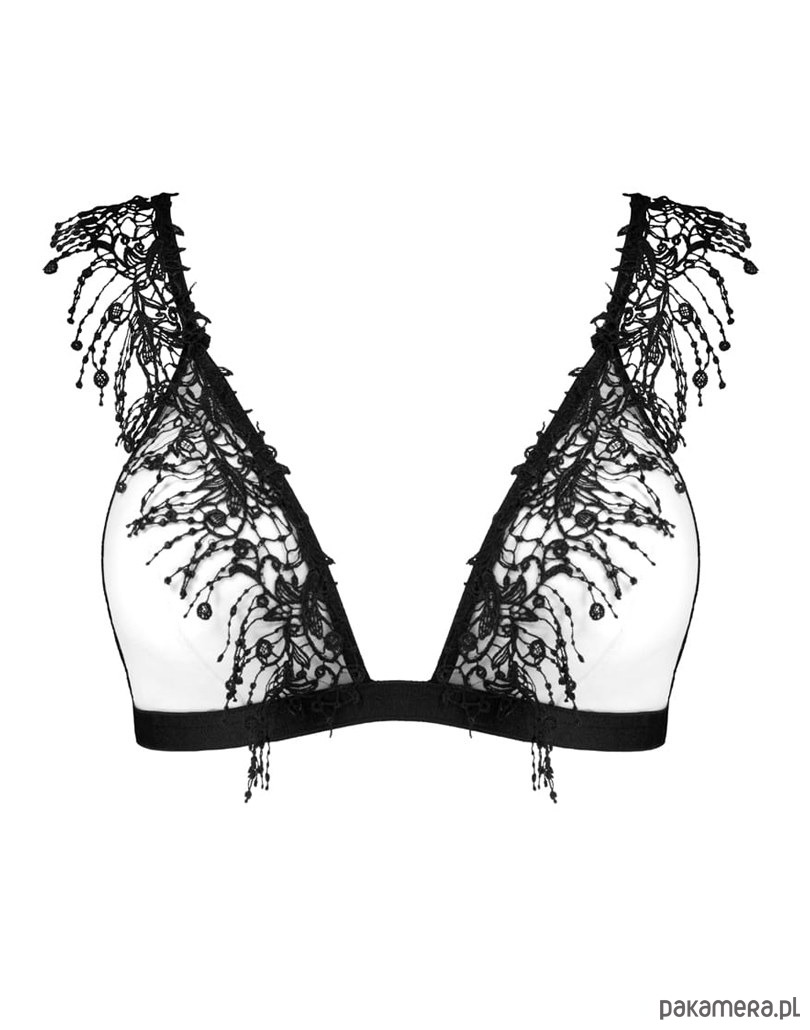 Biustonosz Mad Cat No. 9 to miękki stanik typu bralette uszyty z przezroczystego tiulu ozdobionego czarną gipiurą.