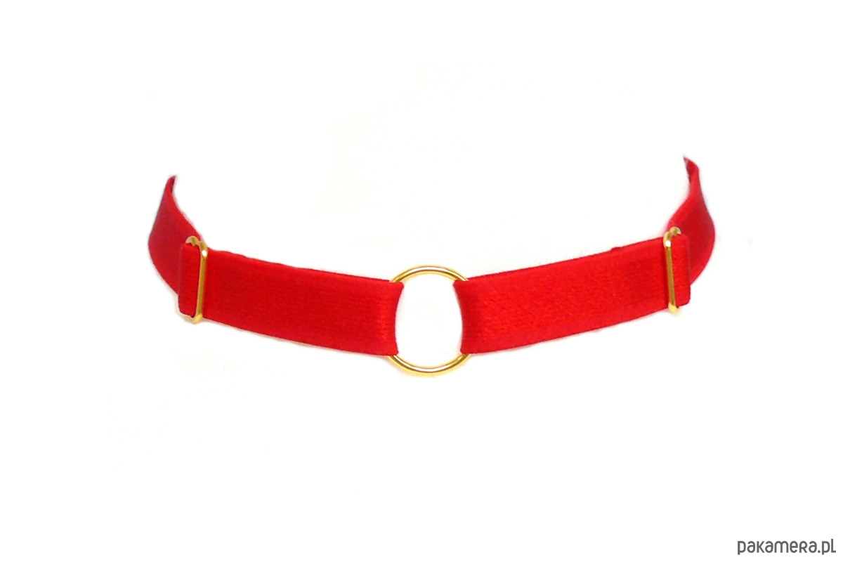 Choker wykonany jest z elastycznej gumy w kolorze czerwonym. Posiada metalowe kółeczko, regulacje oraz zapięcie w kolorze złotym.