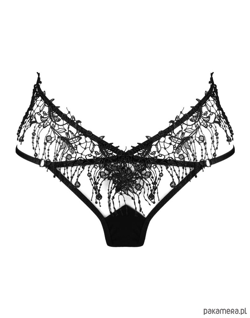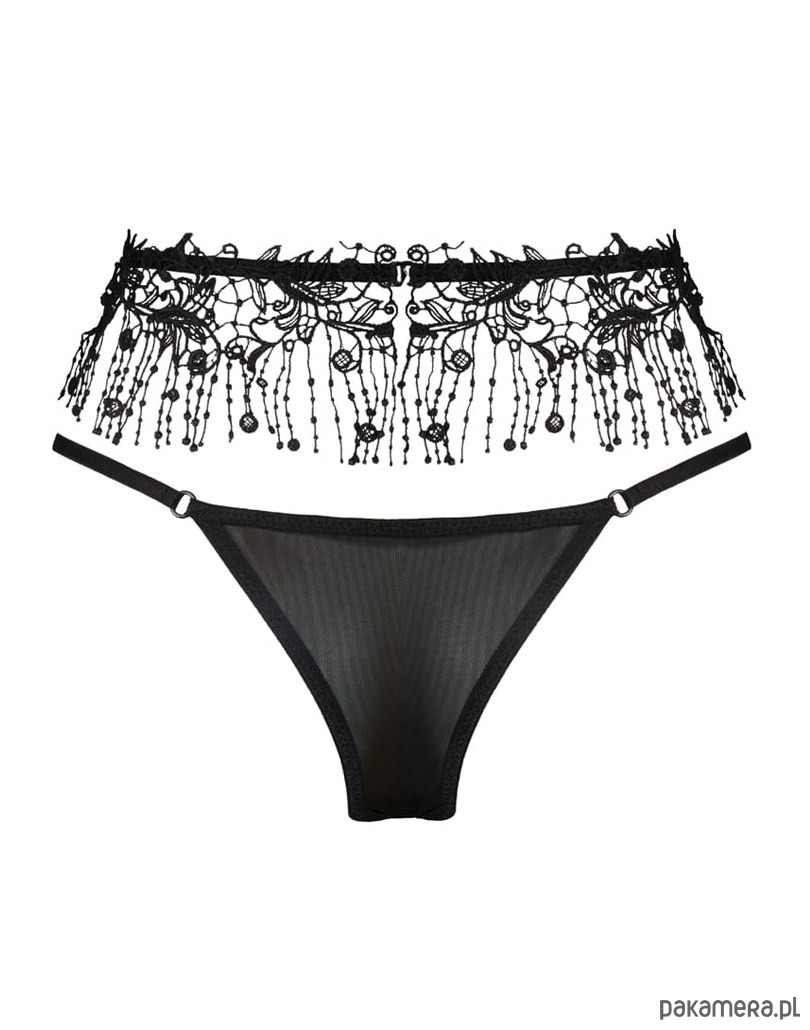Ozdobne stringi Mad Cat No. 9 to połączenie przezroczystego, delikatnego tiulu i gipiurowej czarnej koronki, która ozdabia talię.