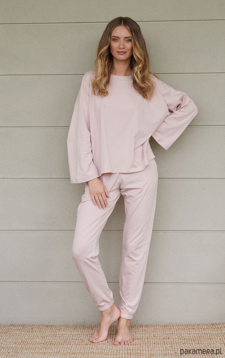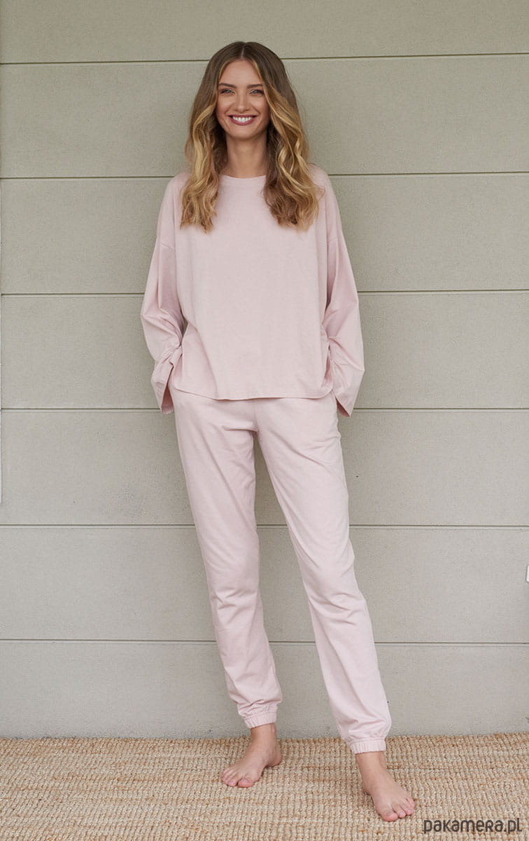 Wygodna oversizowa góra z szerokimi rękawami w zestawie z prostymi spodniami. Zestaw z miękkiej bawełny w monochromatycznym kolorze.