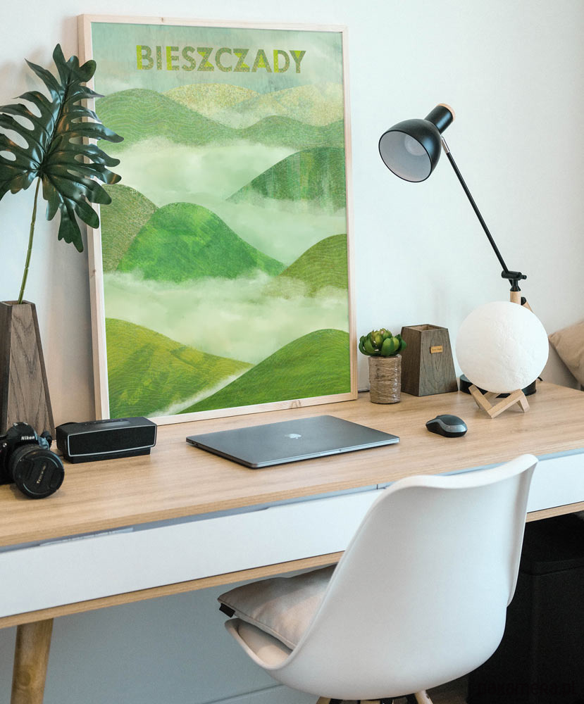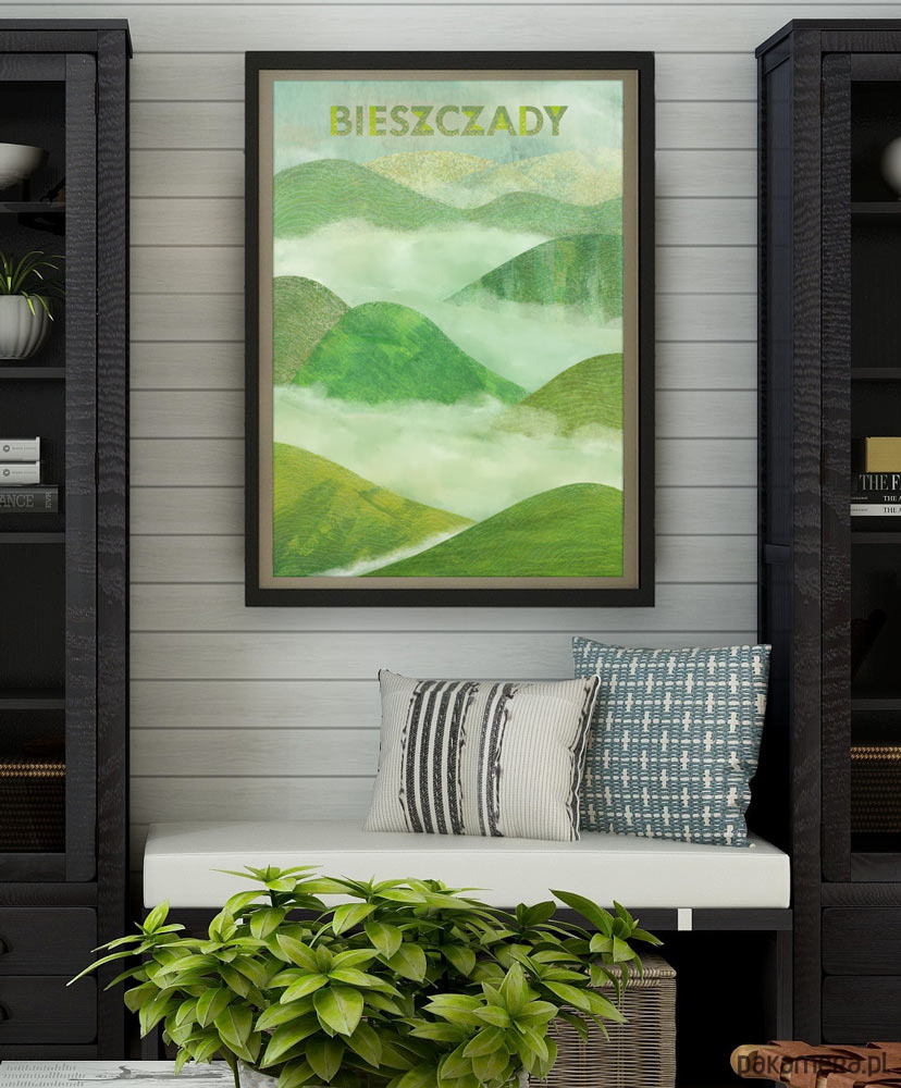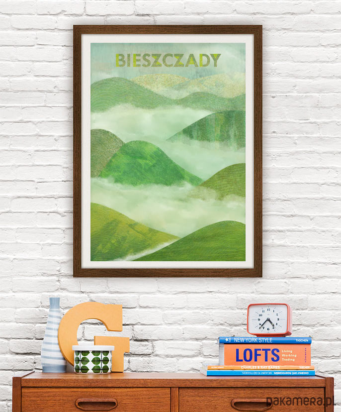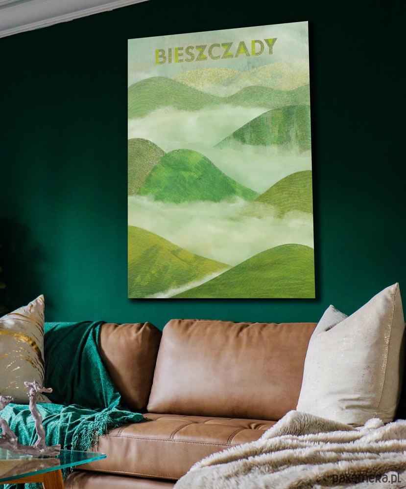 Plakat w stylu vintage przedstawiający charakterystycznie zaokrąglone pasma górskie Bieszczad. Góry na plakacie wyłaniają się z porannych mgieł. Całość utrzymana jest w barwach soczystej zieleni.