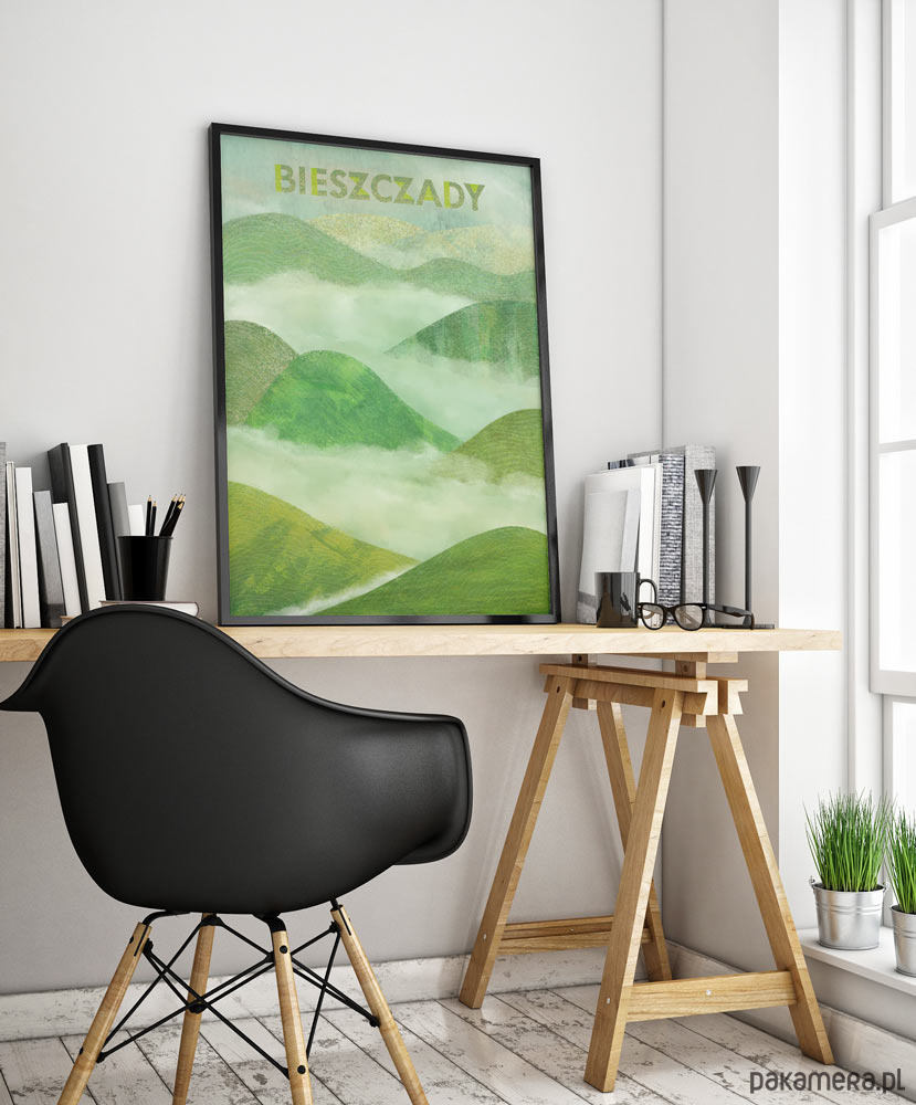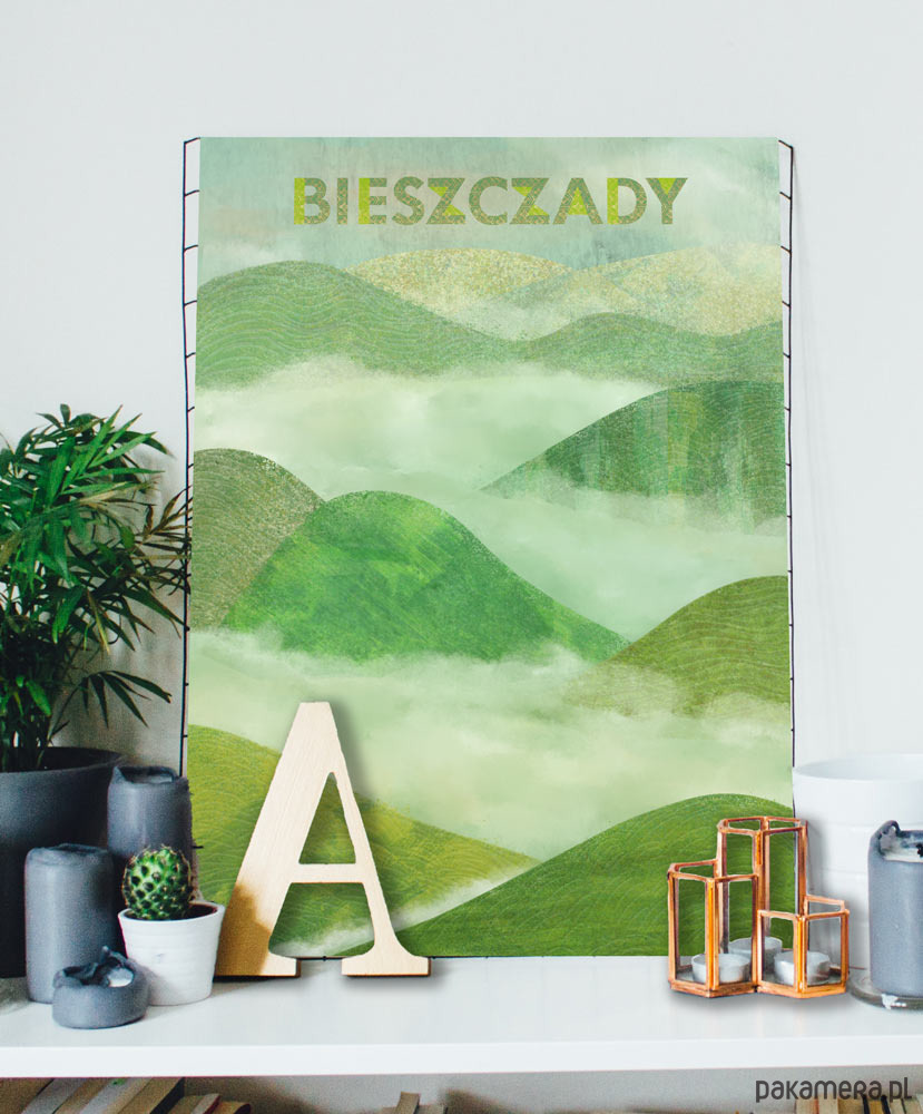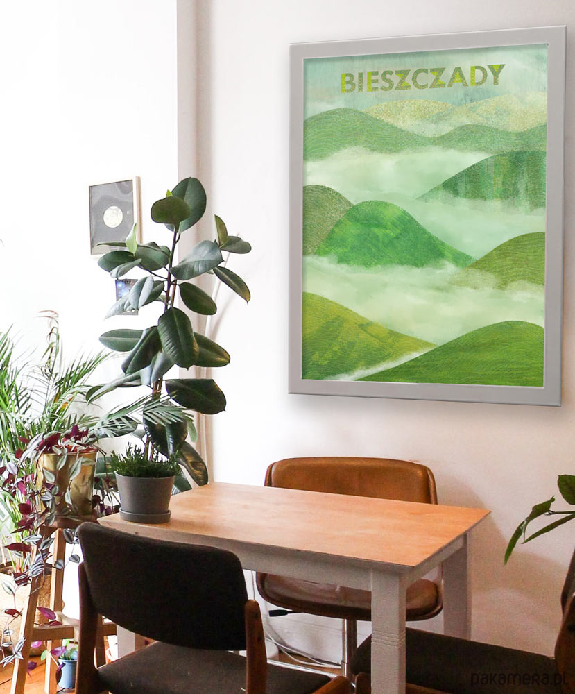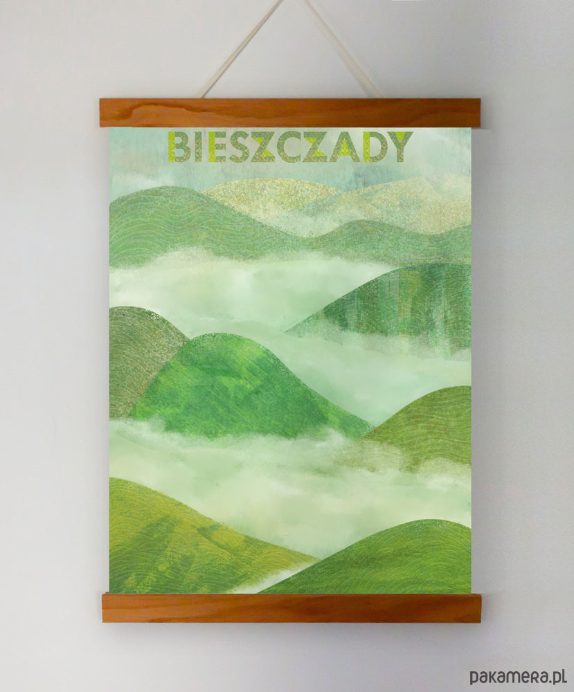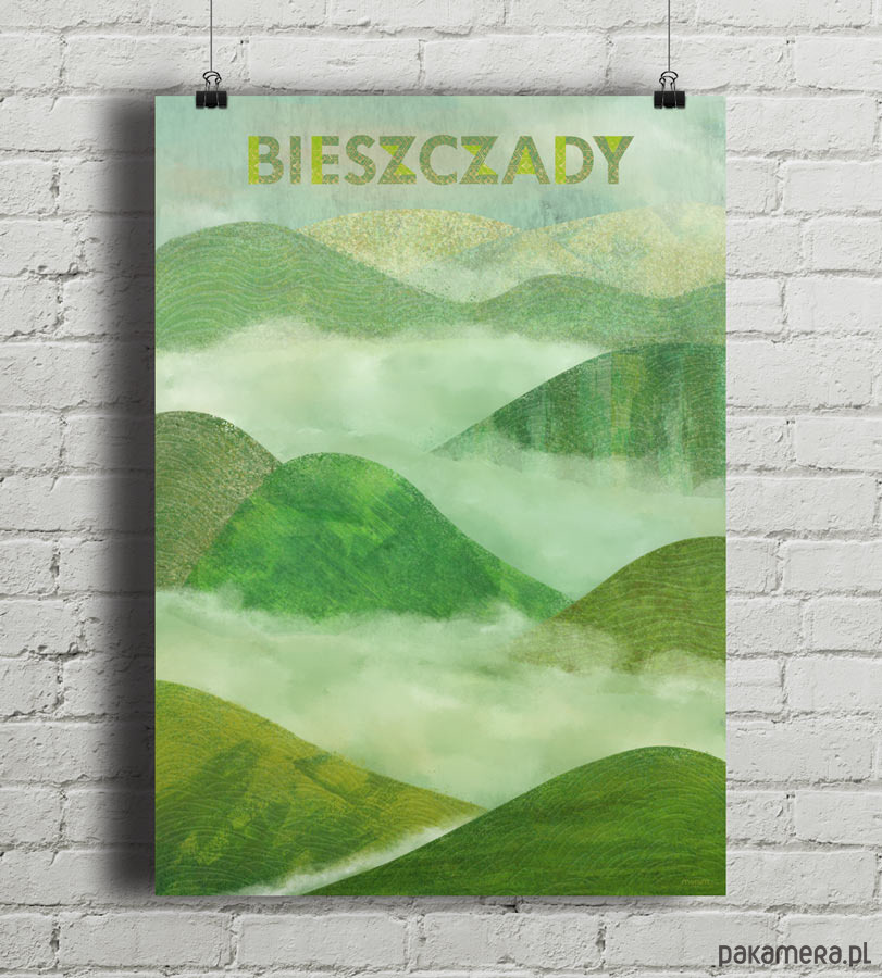 Plakat w stylu vintage przedstawiający charakterystycznie zaokrąglone pasma górskie Bieszczad. Góry na plakacie wyłaniają się z porannych mgieł. Całość utrzymana jest w barwach soczystej zieleni.