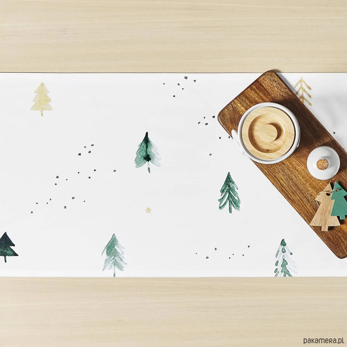 Bieżnik Choinki to świetny sposób na szybką dekorację stołu przez cały okres zimowy, a także w czasie świąt. Wspaniale prezentuje się samodzielnie bezpośrednio na blatach stołów i ław, oraz w połączeniu z obrusem o tym samym wzorze. Bieżnik świąteczny w choinki został zaprojektowany i uszyty w Polsce.