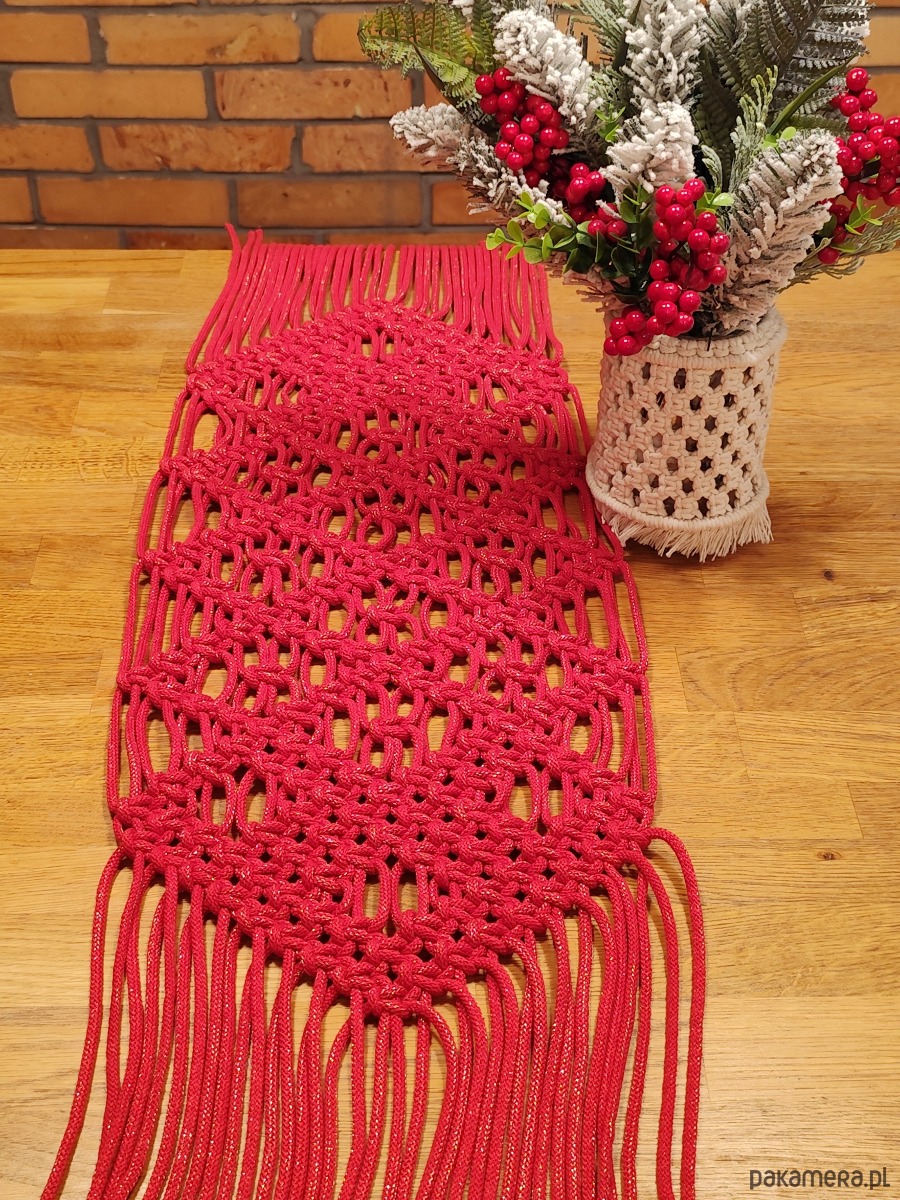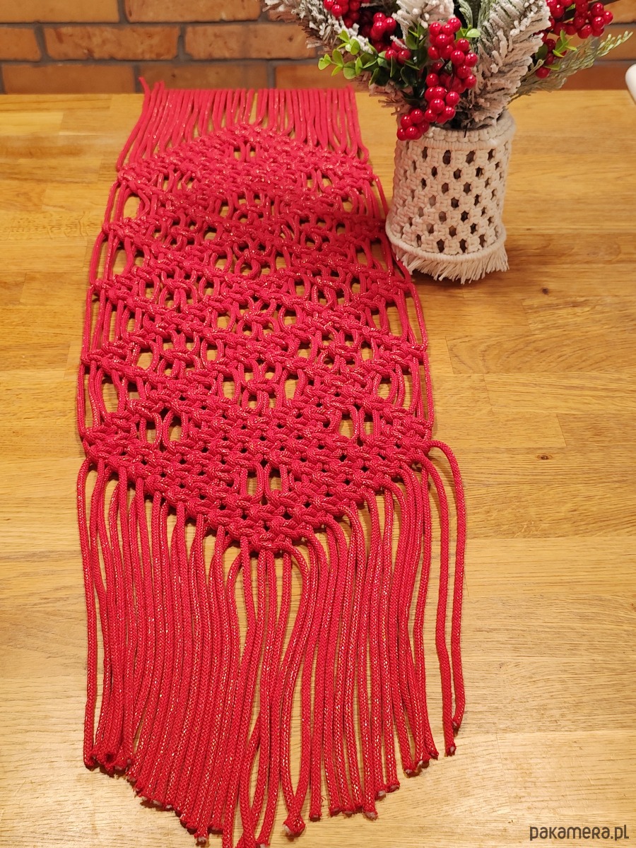 Wykonany z grubego bawełnianego sznurka 5 mm w kolorze klasycznej czerwieni z dodatkiem złotej nitki.