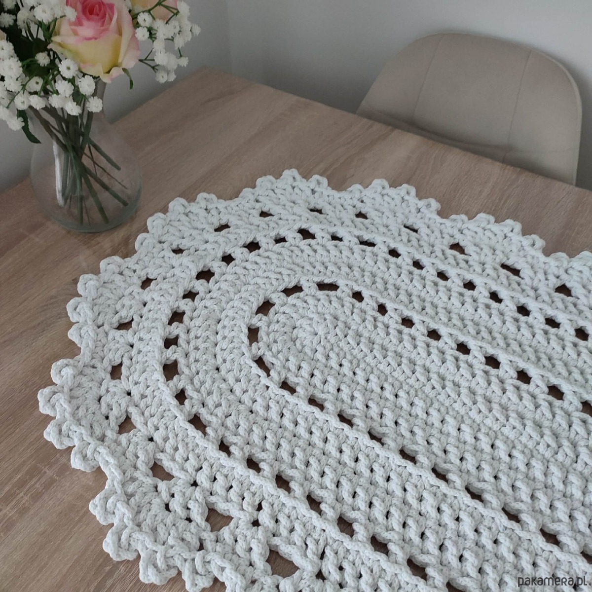 Bieżnik o wymiarach 50cmx95cm, wykonany metodą szydełkowania z polskiego sznurka bawełnianego 5mm.