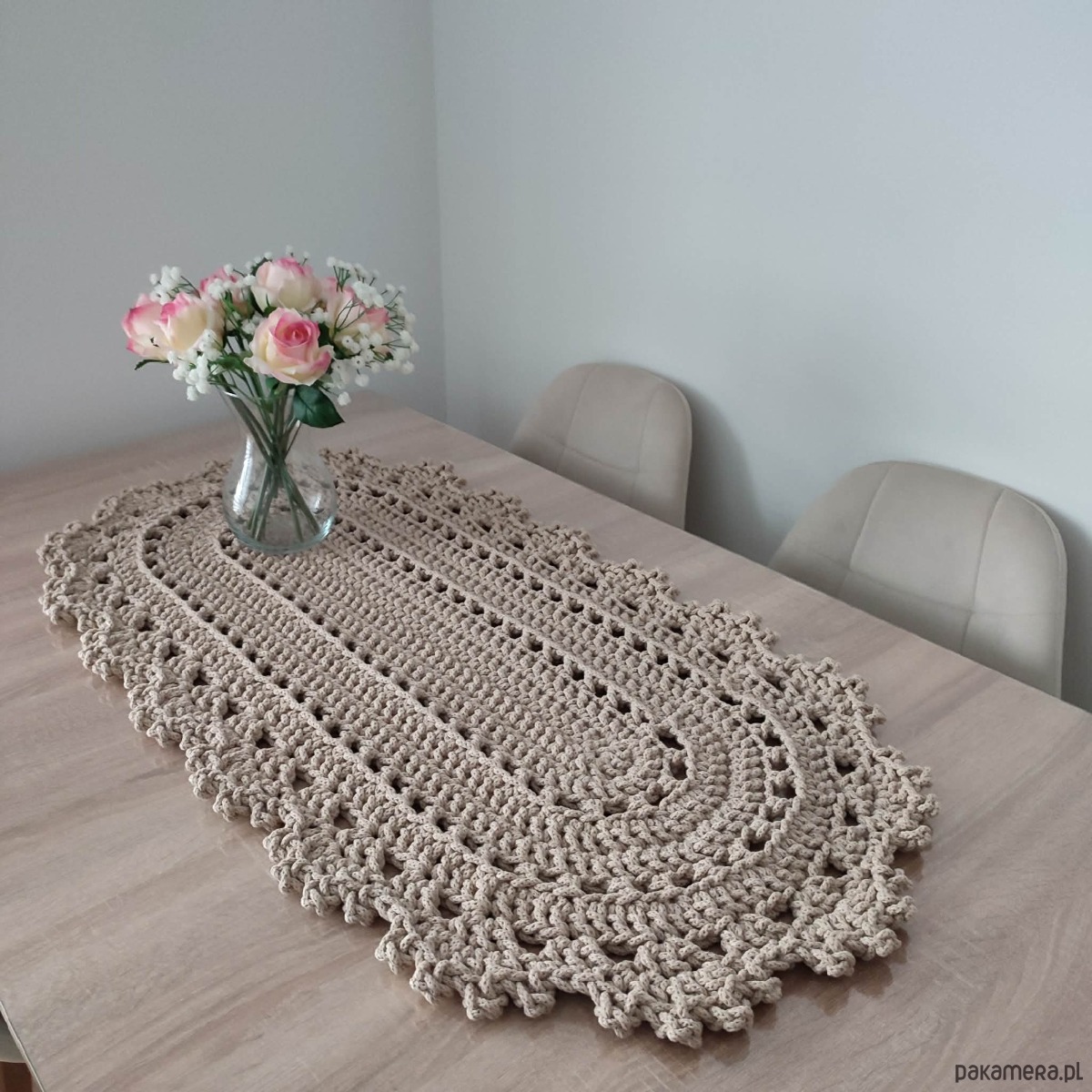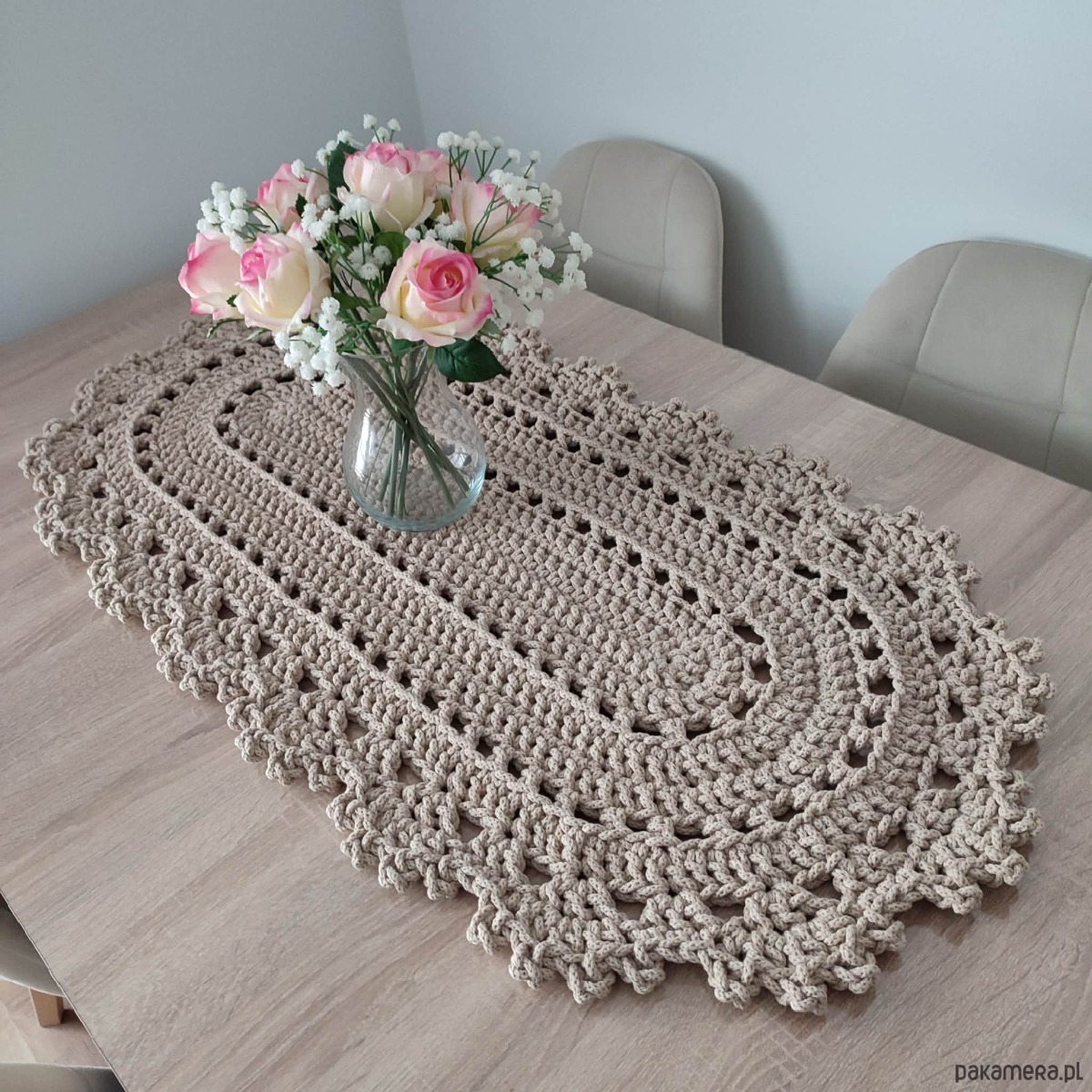 Bieżnik o wymiarach 50cmx100cm, wykonany metodą szydełkowania z polskiego sznurka bawełnianego 5mm.