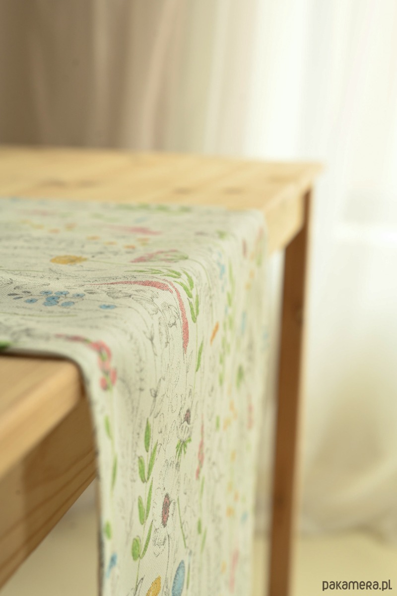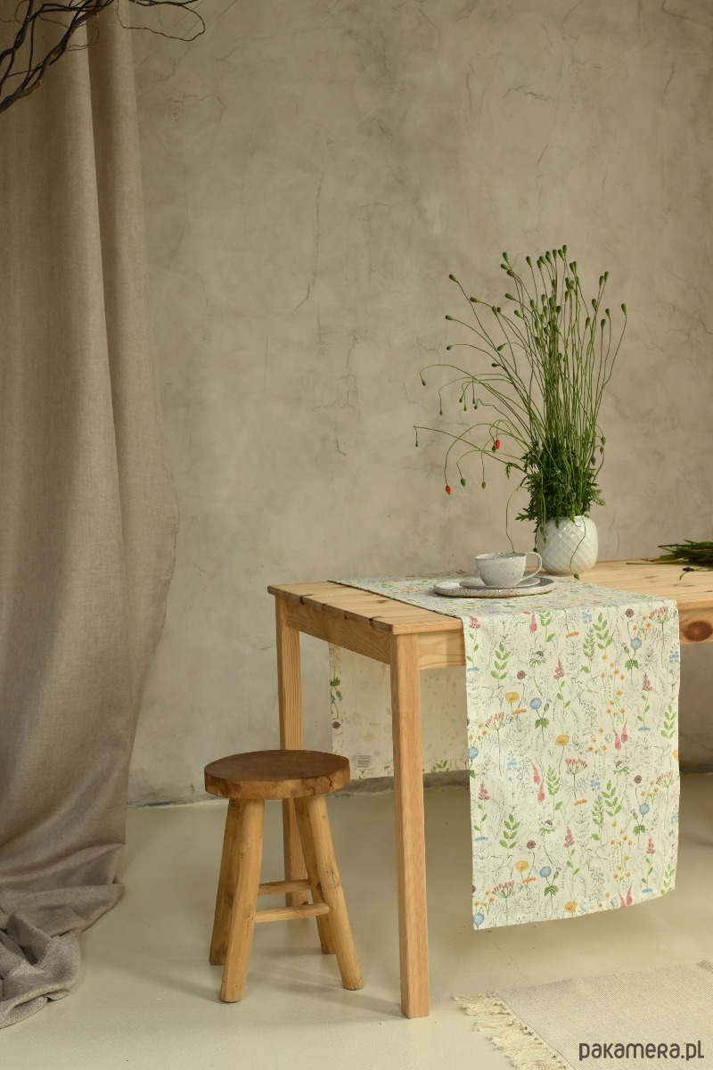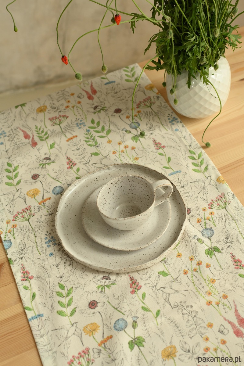 Bieżnik KWIATY łączy w sobie klasykę z delikatnym, domowym urokiem. Jego naturalny, bawełniany materiał w kremowym odcieniu wprowadza do wnętrza atmosferę ciepła i spokoju, stając się doskonałym tłem dla codziennych obiadów oraz świątecznych uczt.