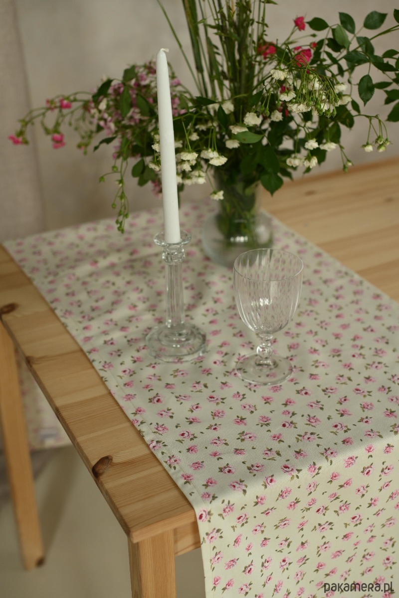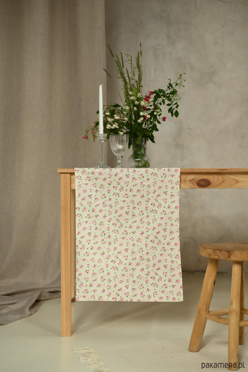 Bieżnik RÓŻYCZKI łączy w sobie klasykę z delikatnym, domowym urokiem. Jego naturalny, bawełniany materiał w kremowym odcieniu wprowadza do wnętrza atmosferę ciepła i spokoju, stając się doskonałym tłem dla codziennych obiadów oraz świątecznych uczt.