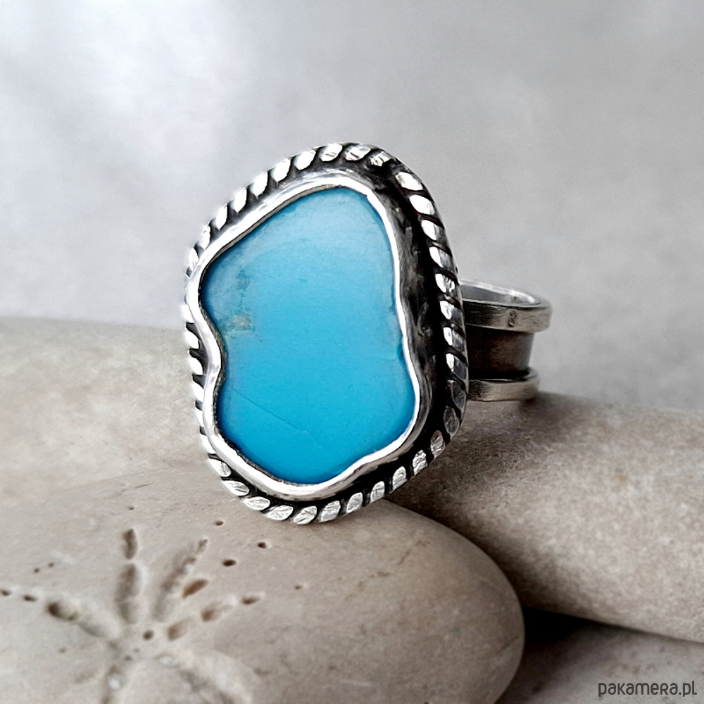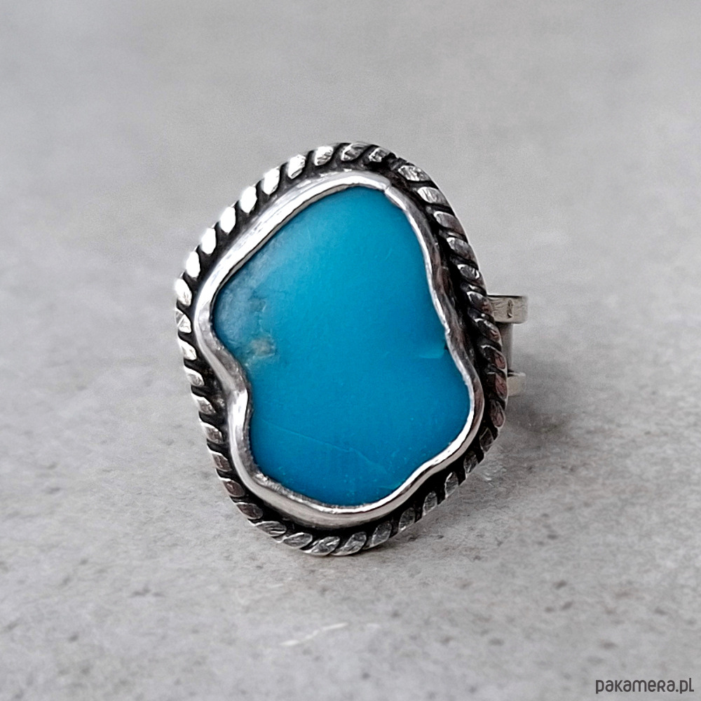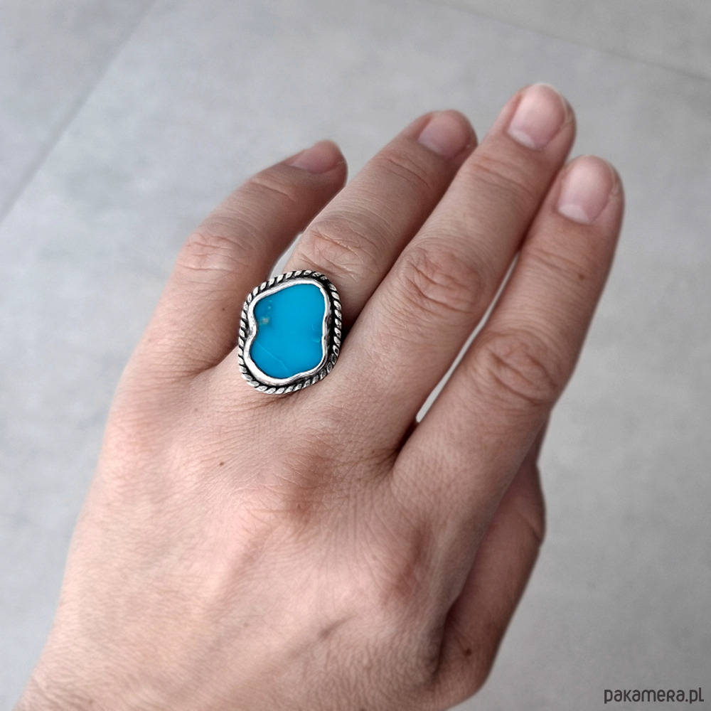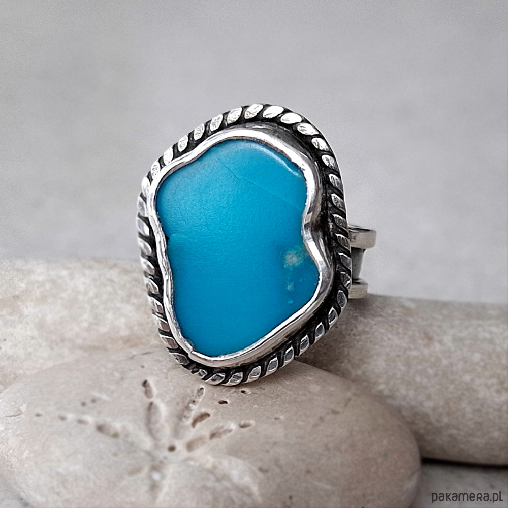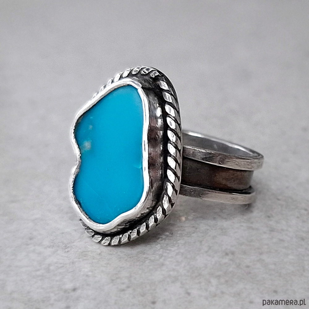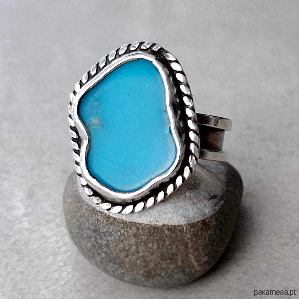 Okazały, srebrny, regulowany, etniczny pierścień o nieregularnym kształcie, zaprojektowany i wykonany od podstaw ręcznie ze srebra 925 i 999. Centrum biżuterii stanowi naturalny turkus o głębokiej błękitnej barwie w formie płaskiego kaboszonu o wymiarach 20x17mm, korona pierścionka została osadzona na szerokiej obrączce 6mm. Wymiary korony pierścionka: ok 18x23mm. Rozmiar obrączki regulowany, ustawiony na rozmiar 14. Całość została zoksydowana i wypolerowana. Biżuteria zostanie ozdobnie zapakowana.